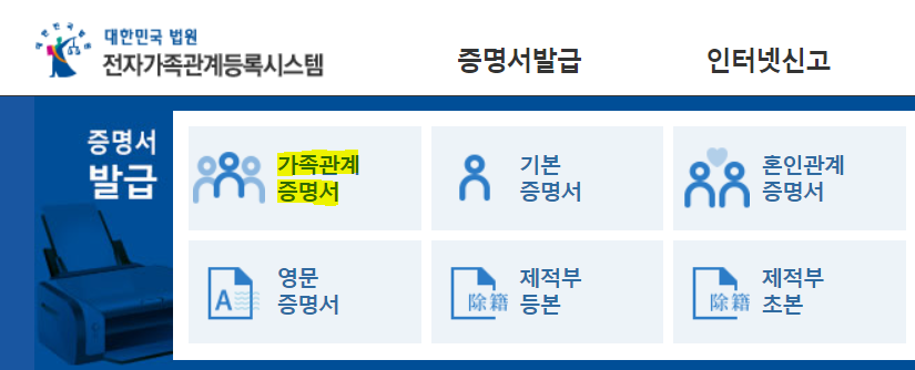홈페이지에 들어가시면 왼쪽상단에 가족관계 증명서를 눌러주세요.