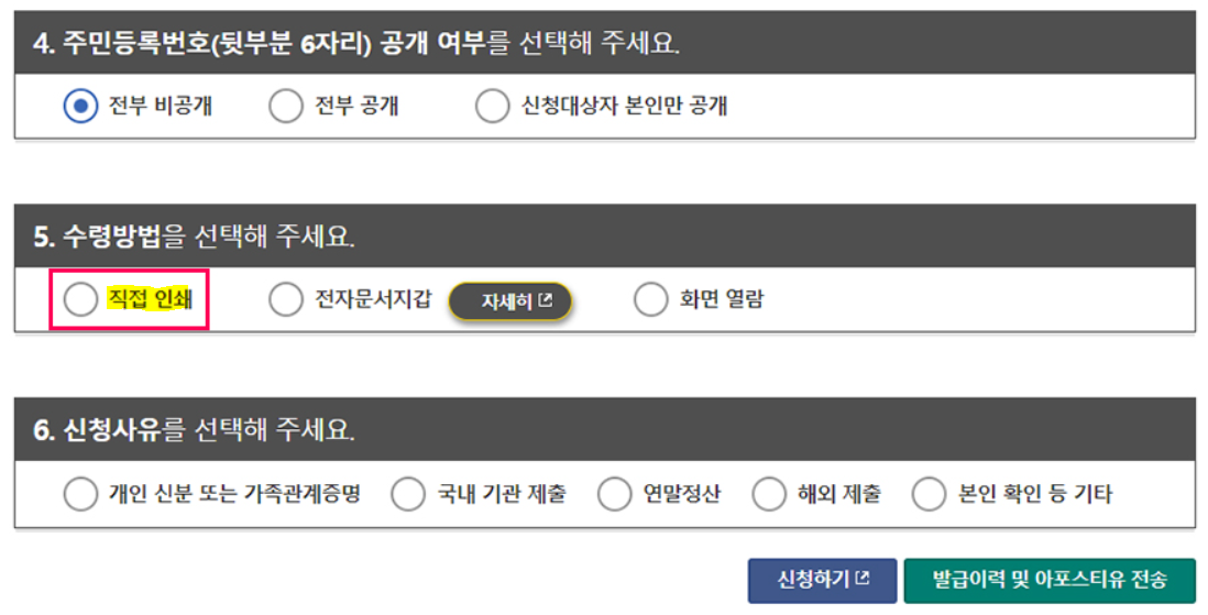 저희는 인터넷으로 발급하고 PDF 파일로 받기 때문에 수령방법은 꼭 직접 인쇄를 선택해 주세요.