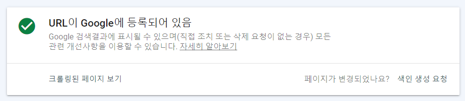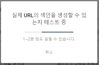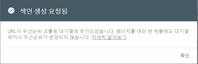 색인이 제대로 요청되면 이런 메세지 창이 나오실겁니다. 하지만 색인 생성이 요청 되었어도 바로는 아니고 몇일이 걸릴수도 있습니다.