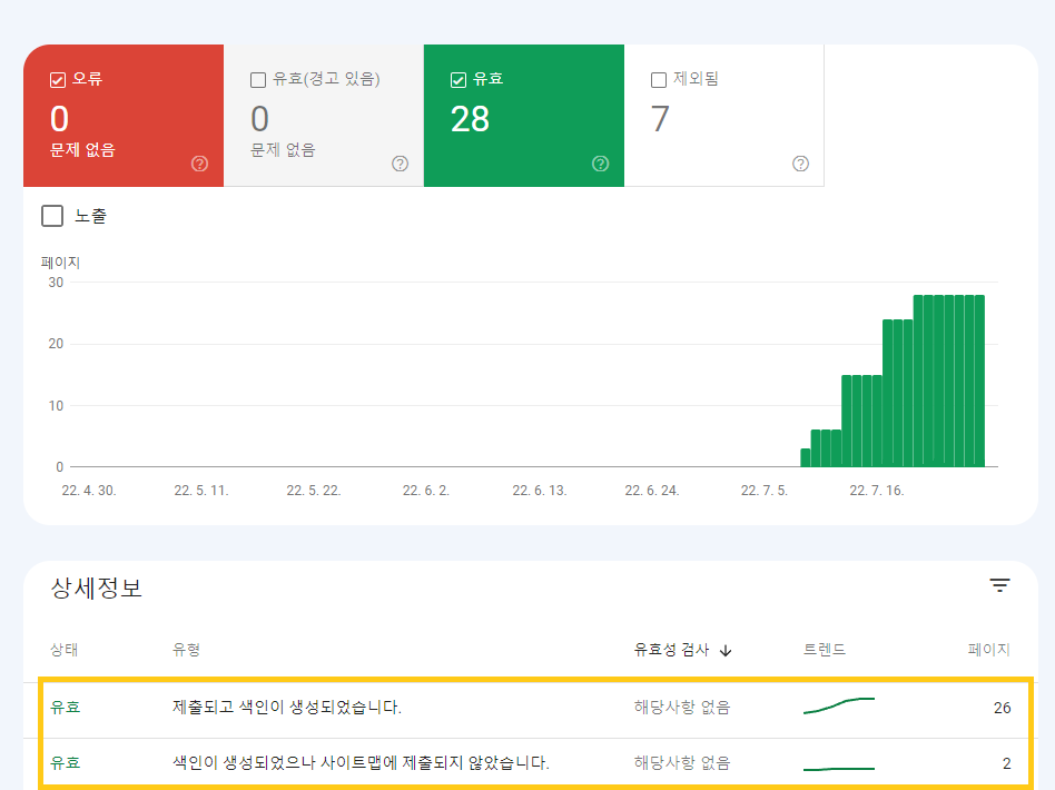 유효에 들어가시면 제출된 색인이 생성이 어떻게 되어있는지 확인 하실 수 있게되는데요.