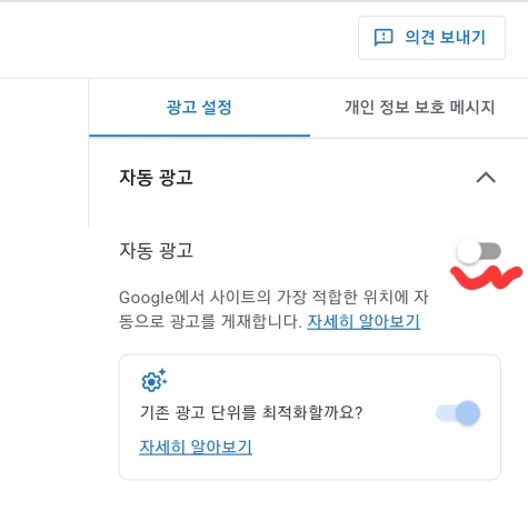 오른편에 광고 설정에서 자동 광고를 눌러주시고