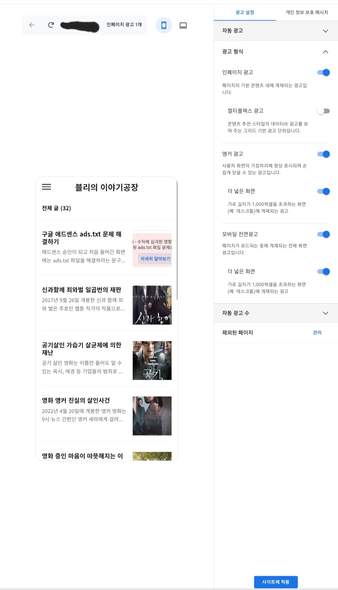 멀티플렉스 광고만 표시되지 않은 것을 발견하시게 될 것이다. 이것 또한 선택해주시고 맨 아래 사이트에 적용을 눌러주세요.  지금 변경사항 적용하기를 누르시면 됩니다.