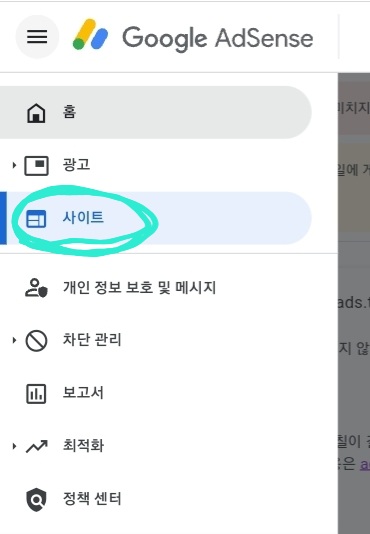 애드센스에서 왼쪽 탭에 있는 사이트에 들어가 주세요.