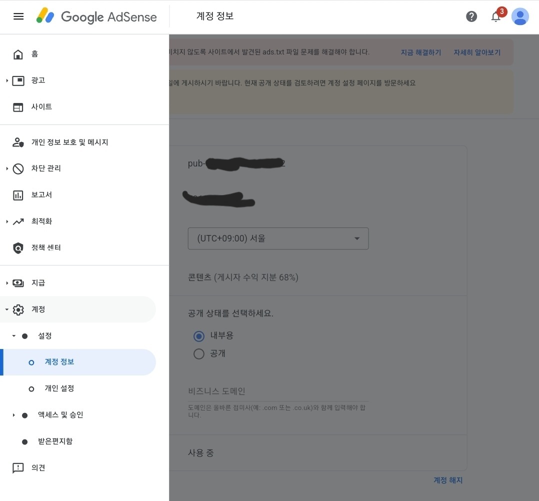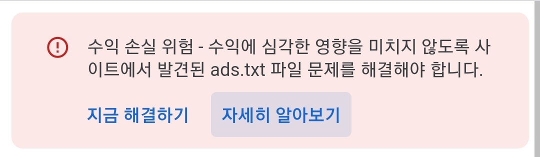 애드센스 승인이 되고 처음 들어간 화면에는 ads.txt 파일을 해결하라는 문구를 확인했습니다. 애드센스를 승인받았는데 이런 문제가 있으니 보자마자 하... 시작도 하기 전에 산 넘어 산이구나 이런 생각이 들더라고요. 돈 벌려고 애드 고시를 두 번이나 떨어지다 겨우 세 번째에 붙었는데 손실이라니!! 하지만 절망할 수는 없죠?ㅎㅎ 해결하면 되니까요