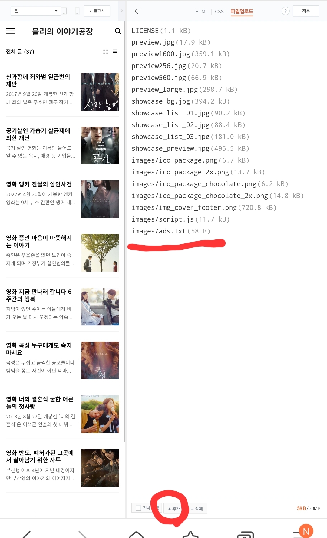 HTML에 들어가시면 오른쪽 상단에 파일 업로드로 들어가 주시면 됩니다. 아래쪽에 추가 버튼을 눌러 아까 다운로드하였던 ads.txt 파일을 넣어주시고 적용 버튼을 눌러주시면 끝!!
