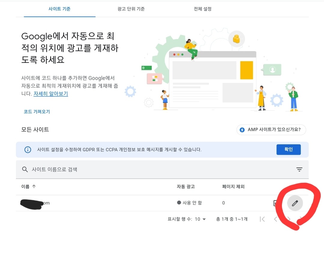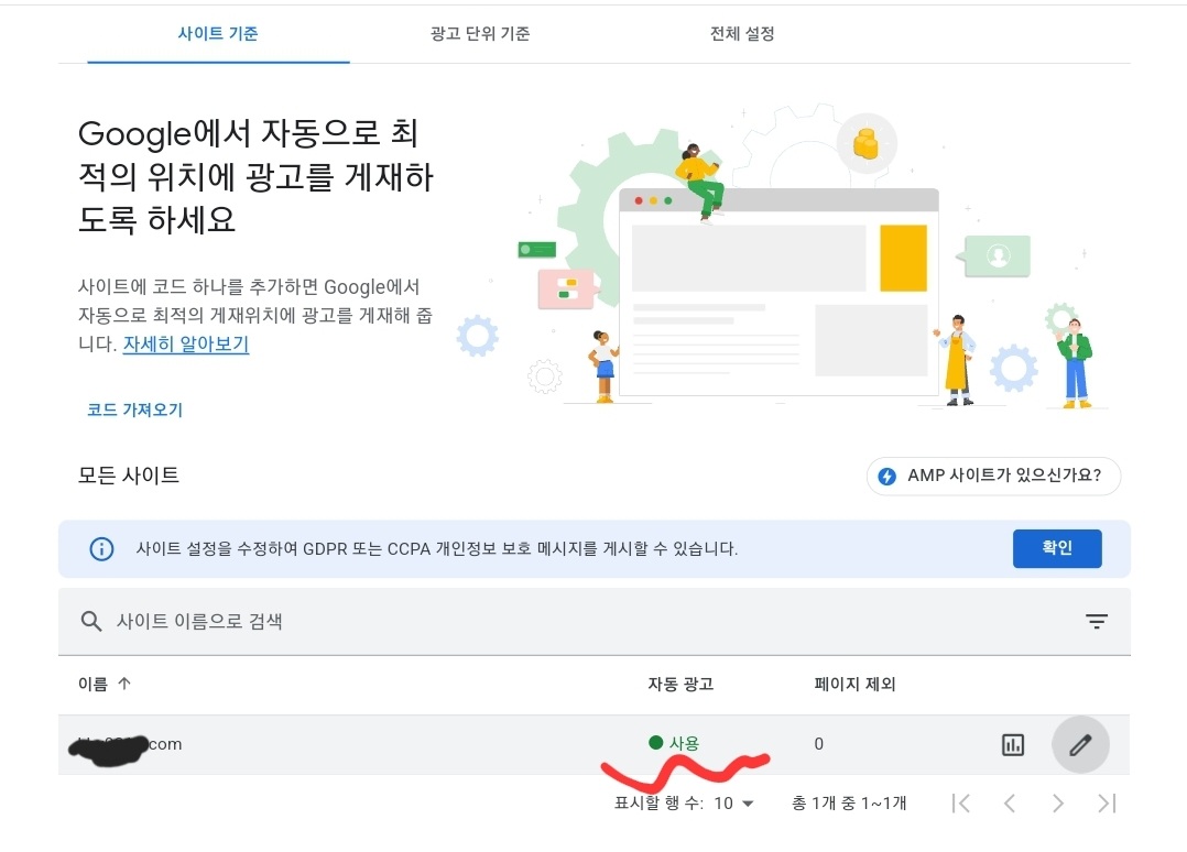 자동 광고가 아직 사용 안 함으로 돼있는 것을 확인하시게 될 것입니다. 연필 모양을 눌러 들어가 주세요.