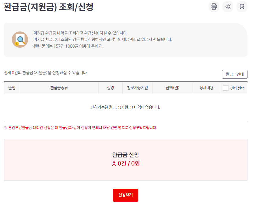 저 같은 경우에는 따로 환급금이 없어 0원으로 뜨더군요. 환급금이 계신경우에는 신청하기를 눌러주시면 됩니다.