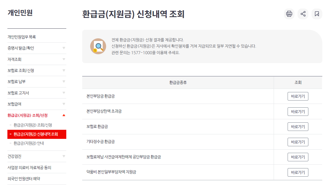 왼쪽 하단 데 지원금 신청내역 조회를 들어간 후 본인부담금 환급금을 확인해 보았습니다.
