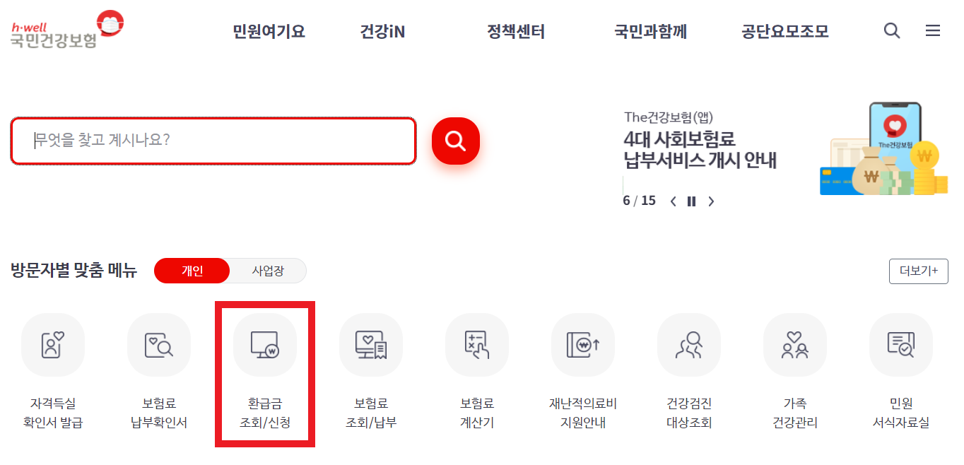 국민건강보험 홈페이지에 접속하셔서 환급금 조회/신청을 눌러 들어가 주세요.