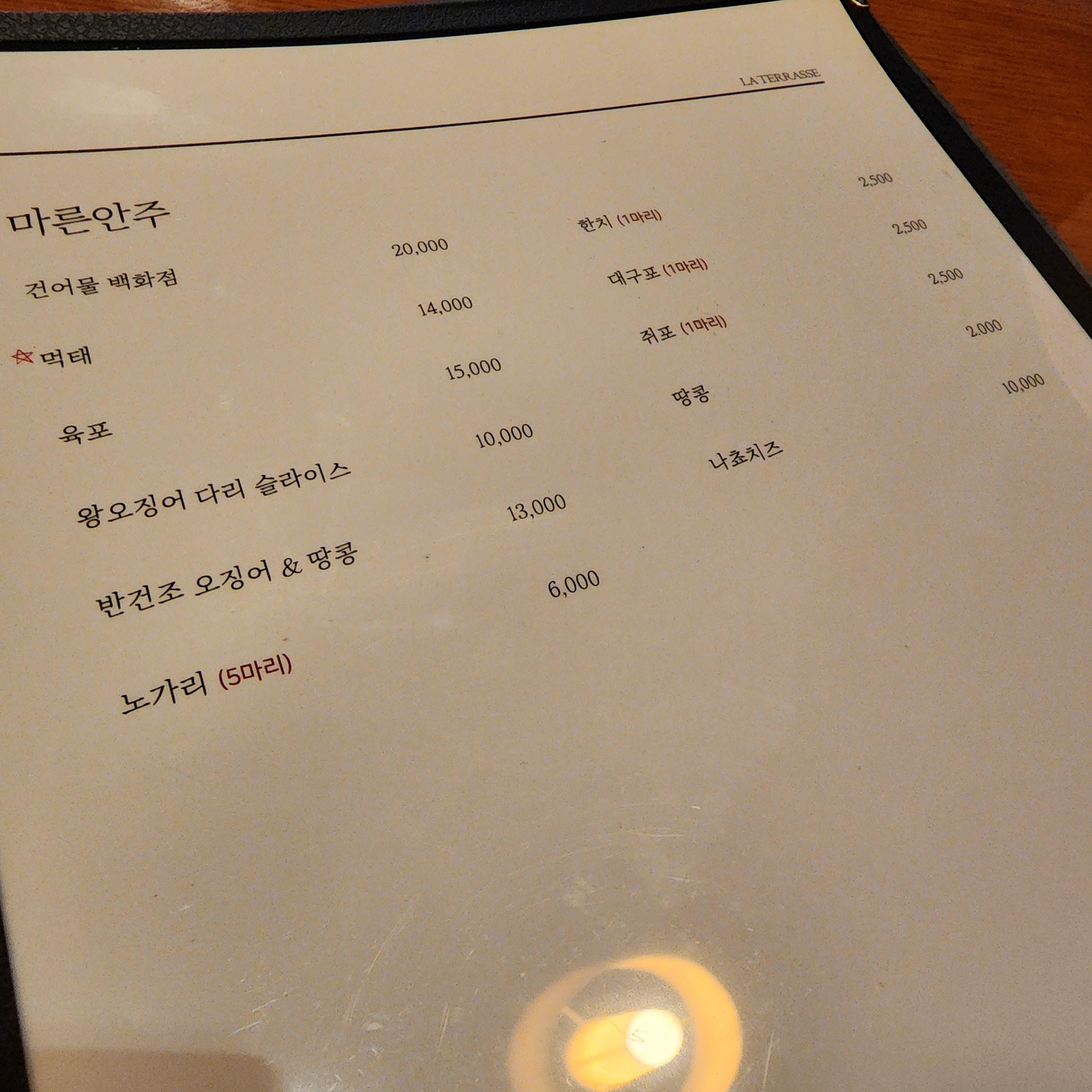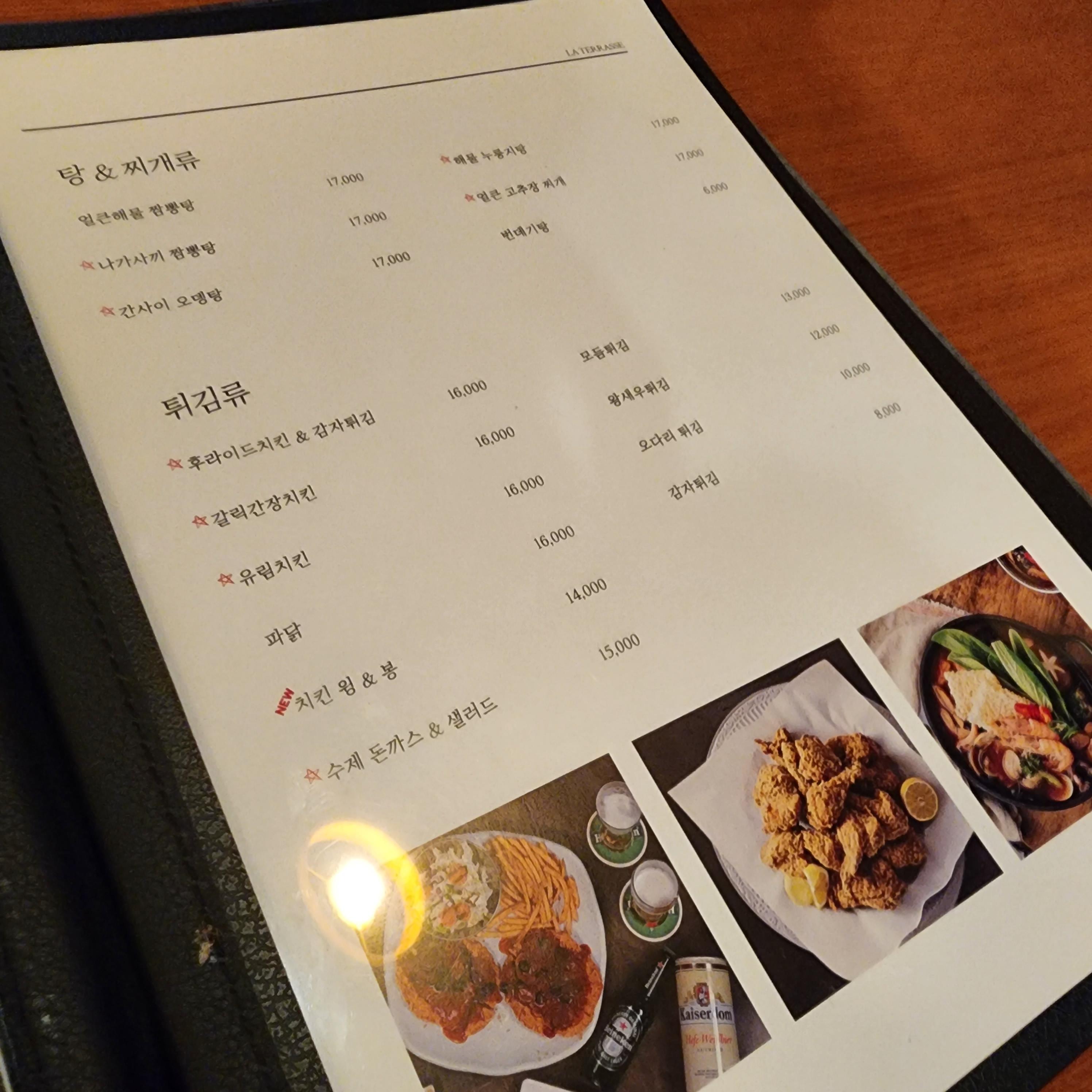 라테라스 메뉴판 책자를 살펴보니 안주들이 다양하게 있었습니다. 최근에 나온 신메뉴도 있었고 더 여러 종류의 술들도 있었지만 간단하게 몇 장만 메뉴판을 찍어보았습니다. 아이들이 먹을 수 있는 메뉴들도 몇 가지 있기 때문에 아이들과 함께와도 괜찮아 보였습니다.