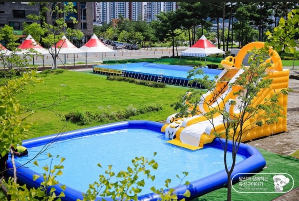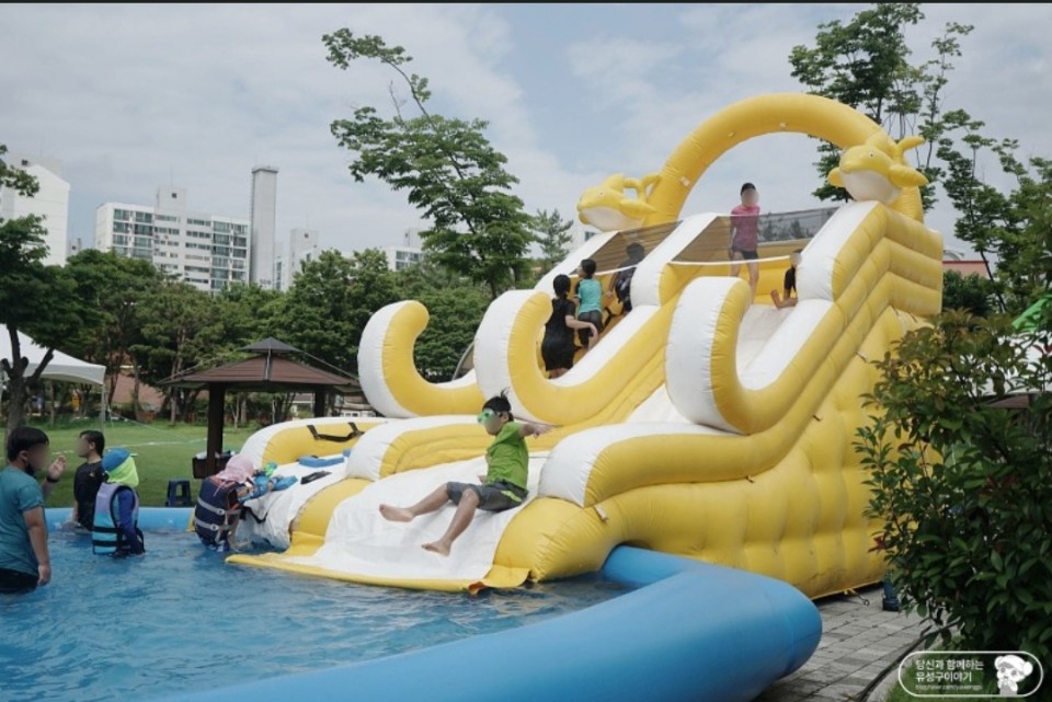 엑스포근린공원에는 전민동 어린이 물놀이장이 있습니다. 에어바운스를 타고 오는 아이들이 정말 재밌게 노는 모습을 보니 바로 수영장으로 뛰어들고 싶으신 생각이 지 않으신가요? 아이들이 이곳에서 뛰어놀면서 신나하는 모습을 상상해보니 어서 저희 아이들도 데리고 가서 놀고 싶어지는 기분입니다.