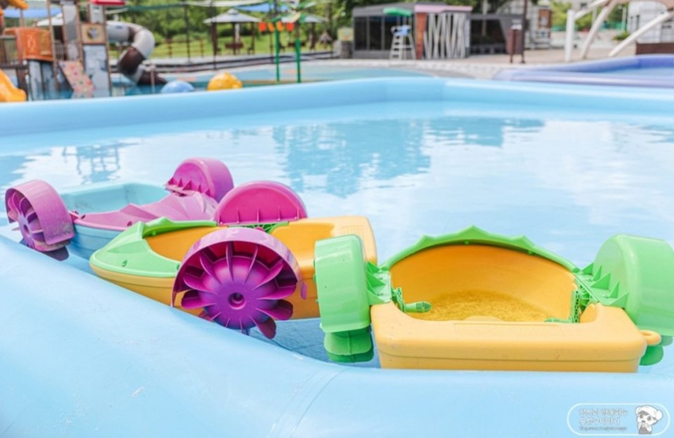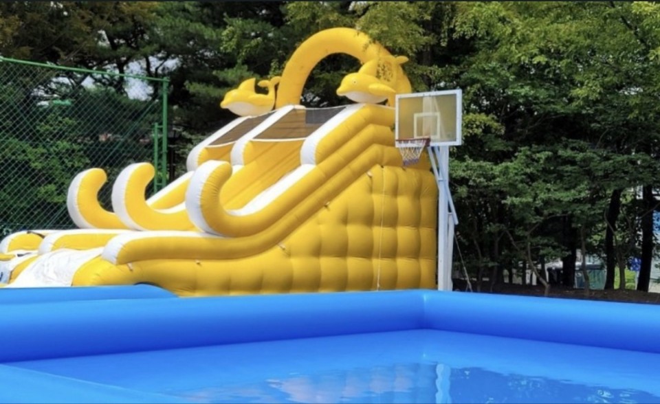 대형풀장에는 미니 수중보트가 준지되어 있으며 아이들이 좋아하는 에어바운스도 준비 되어있습니다. 두곳에 에어바운스가 설치 되어있어 아이들이 한쪽에서 분비지 않고 놀수 있어 좋습니다. 또한 대형풀장이 4곳으로 나누어져 있습니다.