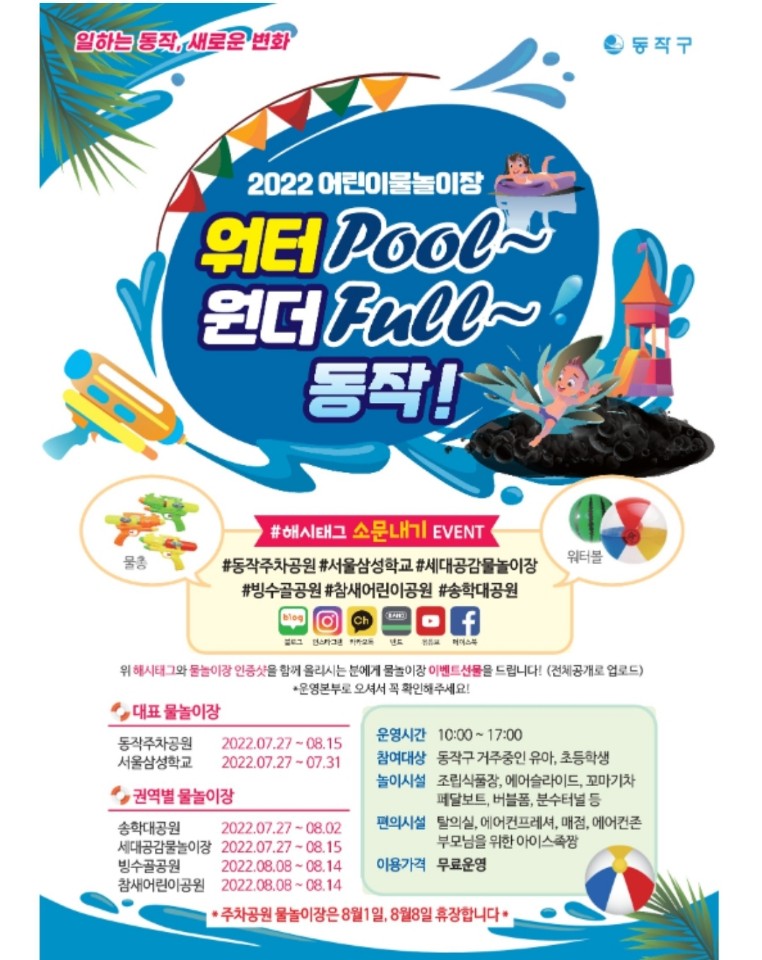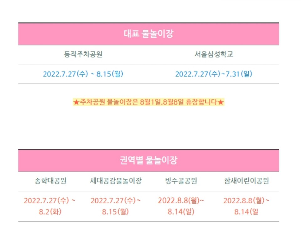 대표 물놀이장으로 동작주차공원, 서울삼성학교 가 있으며 권역별 물놀이장으로 4곳이 운영됩니다.