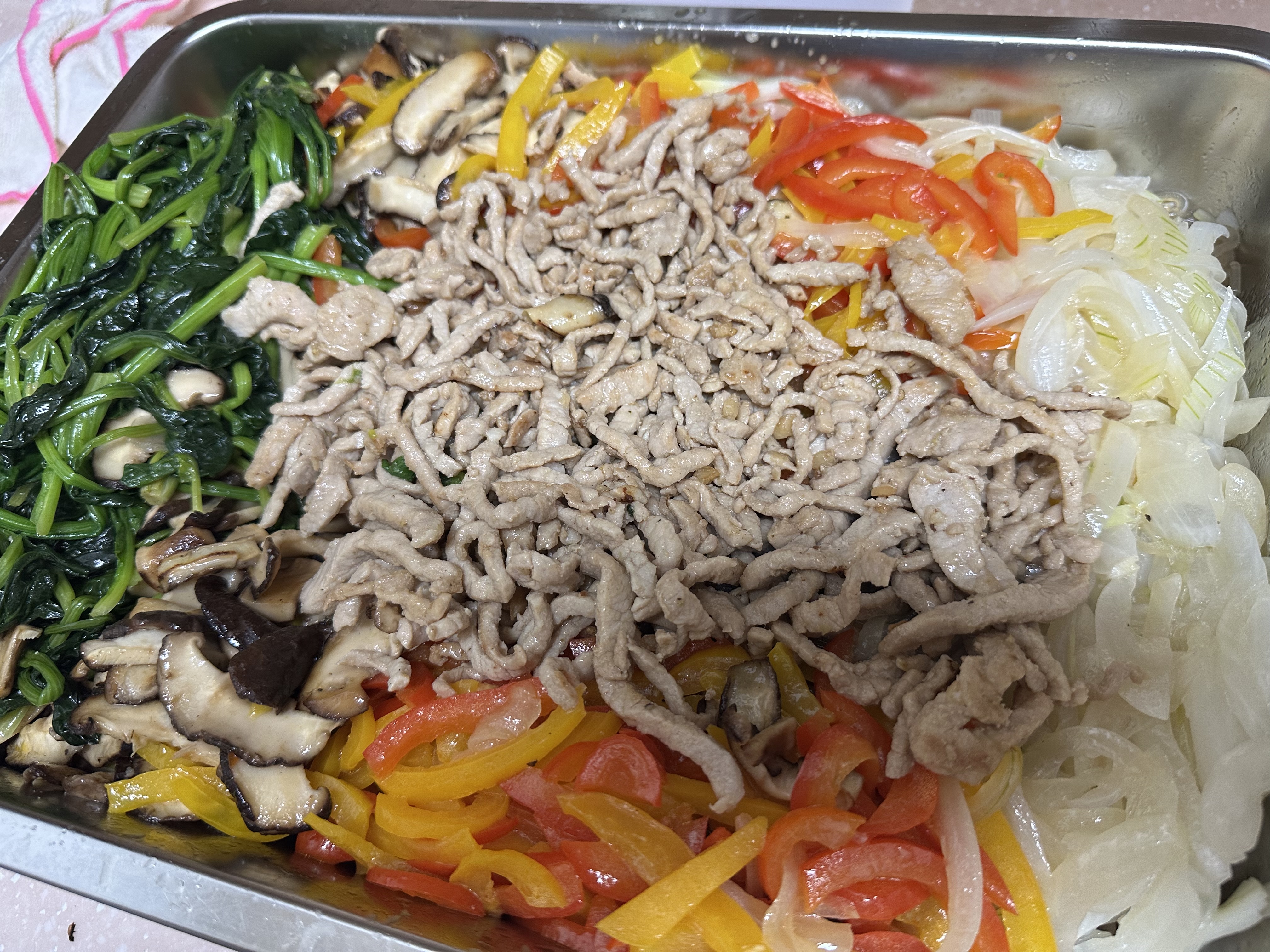 모든 야채들은 손질 후 소금간을 하며 볶아주었고 , 고기는 간장1, 참기름1, 다진 마늘 조금넣고 미리 양념 한 후 야채를 볶은 다음 마직막에 볶았어요.