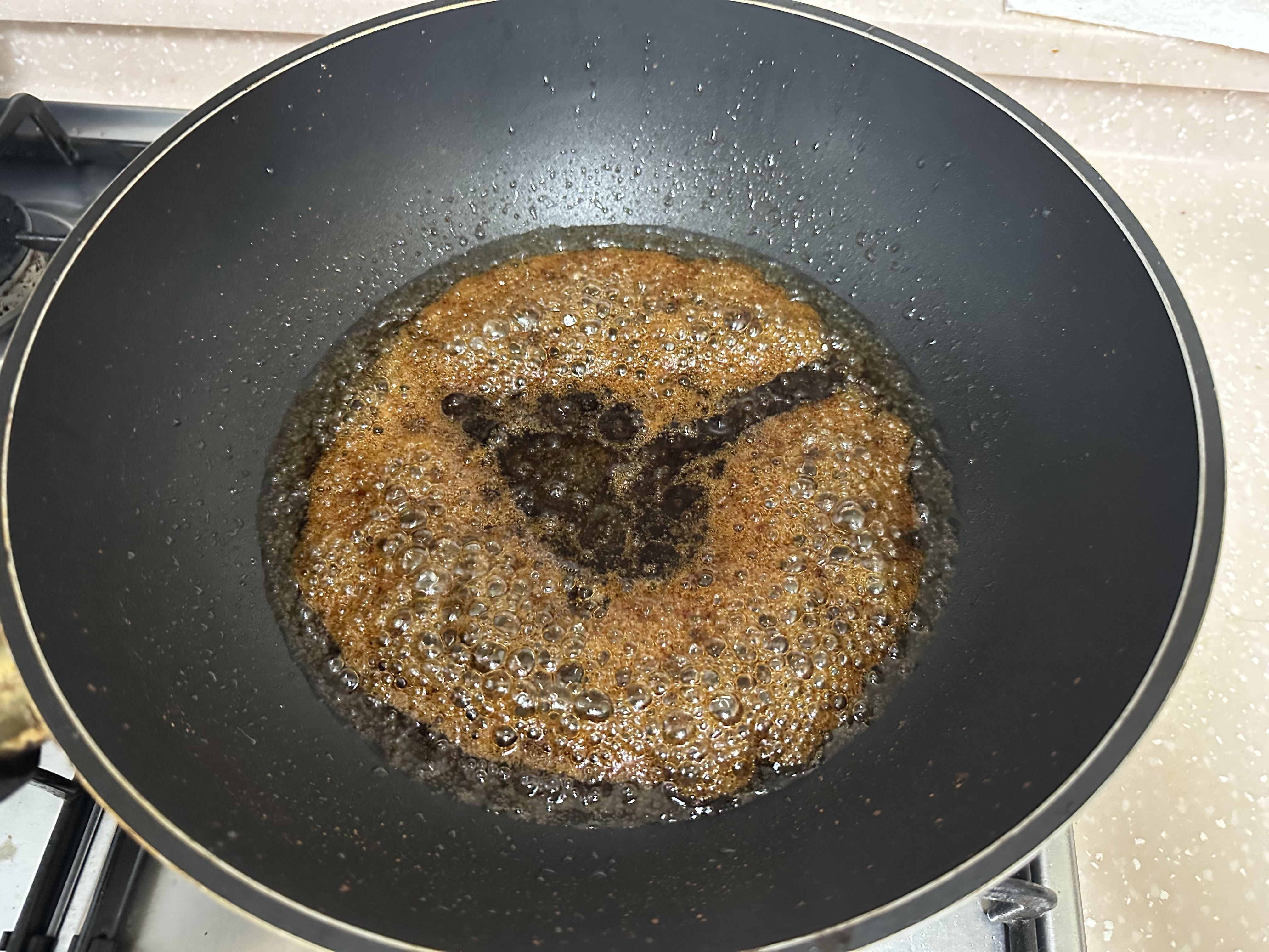 양념장은 간장 8스푼, 설탕 6스푼, 기름 5스푼, 후추 섞어 만들었어요. 양념이 바글바글 끓으면 당면을 넣어 잘 섞어 볶은 후, 볶아둔 채소와 고기를 넣고 섞으면 끝!