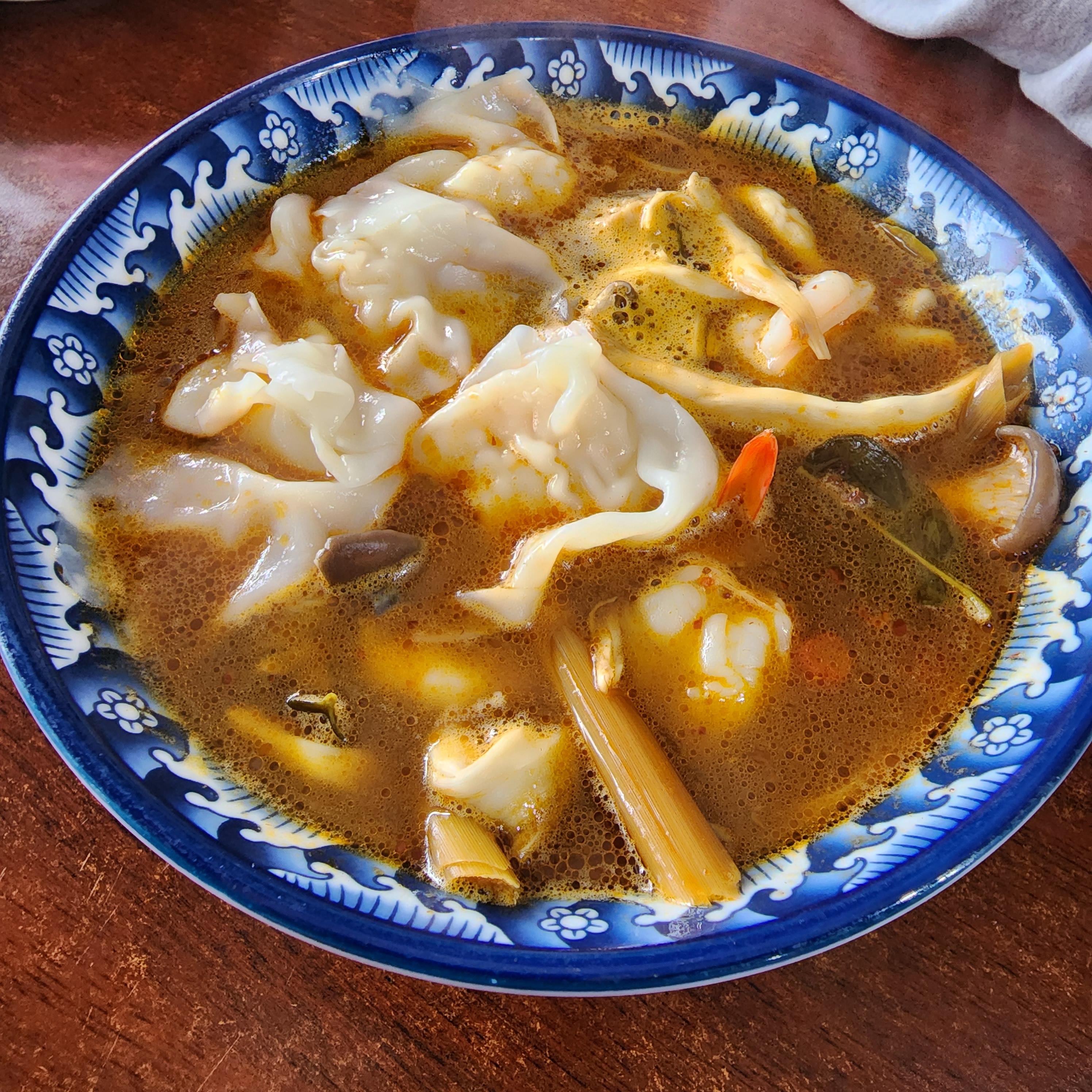 주문한 똠양 완탕 쌀국수가 제일 먼저 나왔습니다. 국물을 먹어보니 역시나 시큼한 맛이 나더군요. 나뭇가지처럼 생긴 것을 건져 보니 향기가 많이 나니 향신료인 거 같았습니다. 똠 양궁이 먹으면 시큼하면서도 맛이 특이한데 계속 먹게 되는 맛이더군요.
