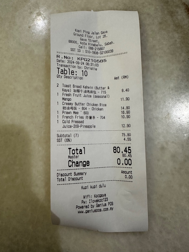 위에 모든 메뉴를 주문했을 때의 가격으로 보면 80.45 링깃으로 대략 24,000원이 조금 넘는다.