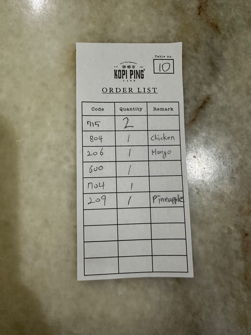 코피핑에서 음식을 시키기 위해서는 식탁위에 컵이 하나 있는데 그 곳에 주문서를 적으면 된다.(컵에 적혀 있는 것은 테이블 번호) 자기가 원하는 메뉴와 갯 수를 적고 계산대에 가 계산까지 마무리하면 메뉴가 하나씩 나올 때 마다 테이블로 가져다 주신다.