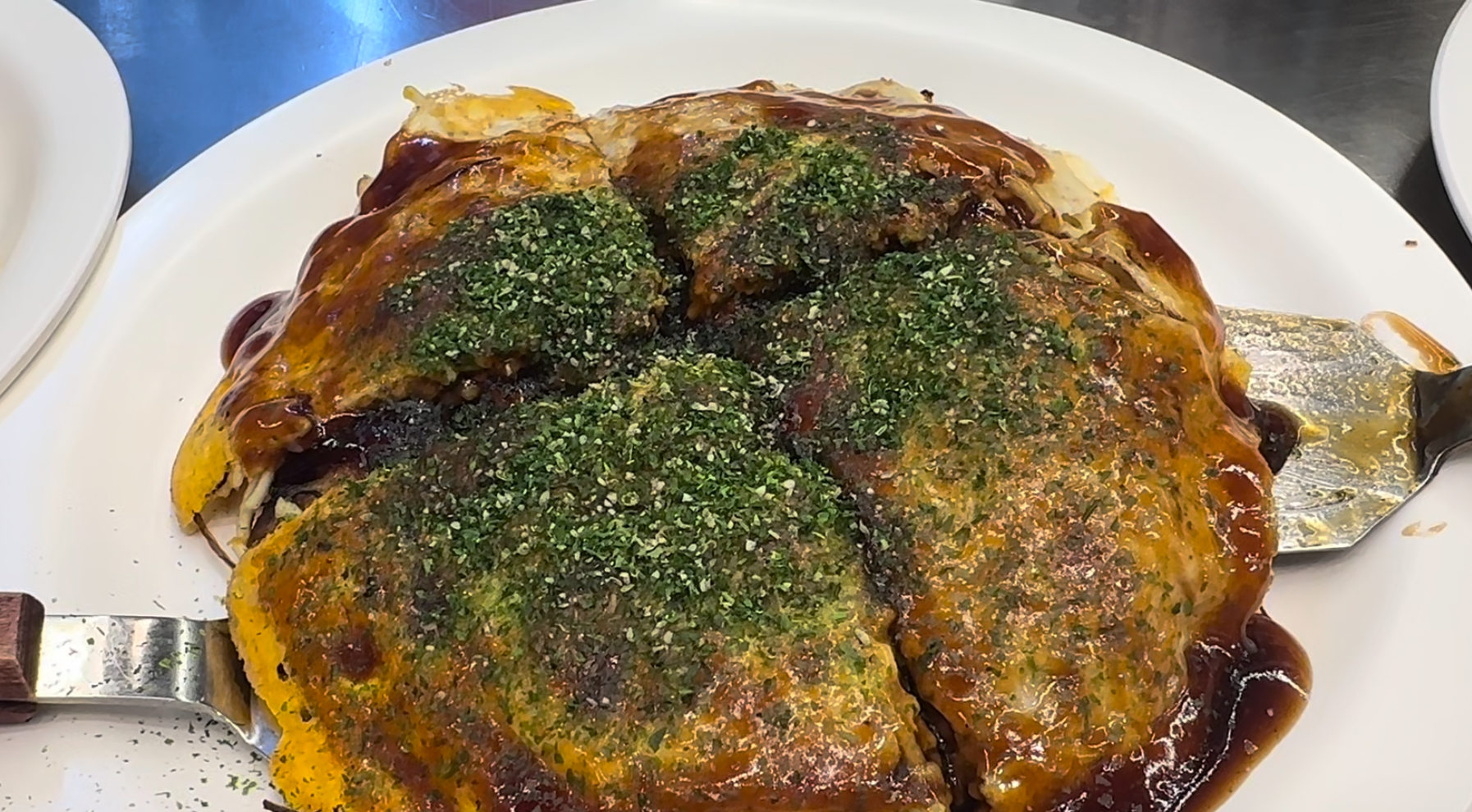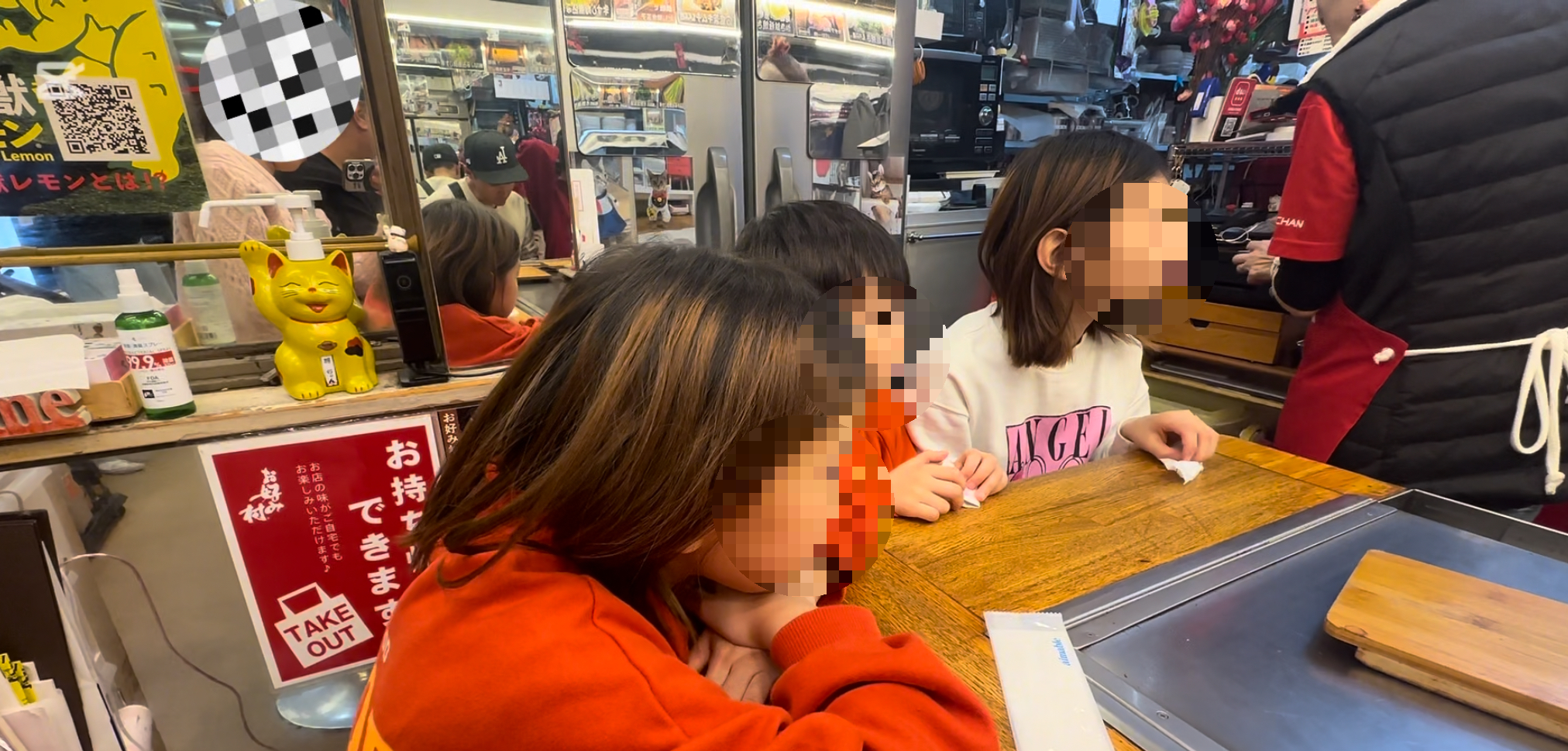 주문을 하면 바로 앞에서 즉석으로 오코노미야끼를 만들어 주신다. 아이들이 있다보니 철판 바로 앞은 위험해 구석쪽으로 자리를 잡았고 그러다보니 만드는 모습이 잘 안보일 수도 있지만 바로 만들자 마자 먹을 수 있고 음식이 엄청빨리 식는것이 아니기 때문에 나쁘지 않았다.