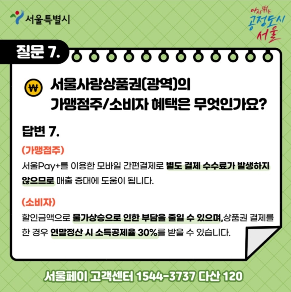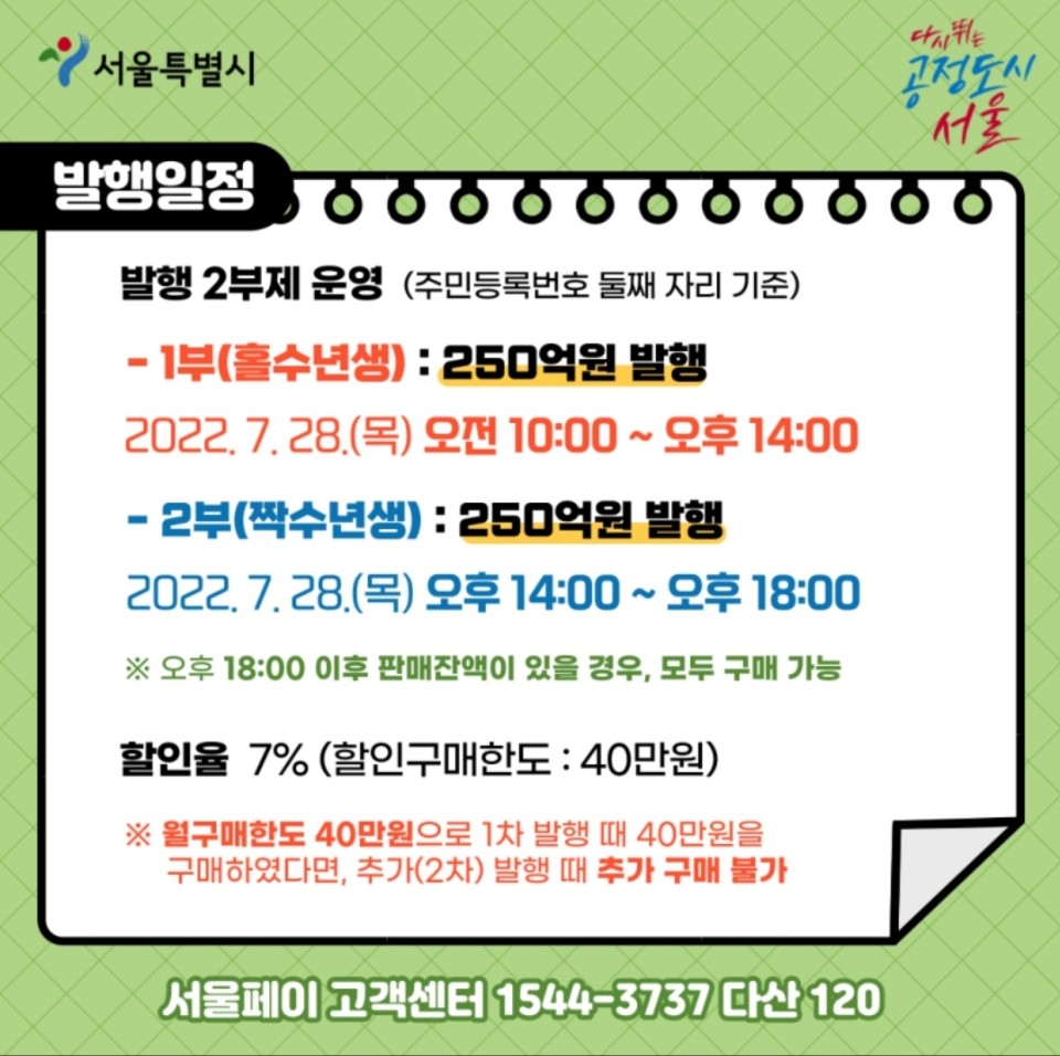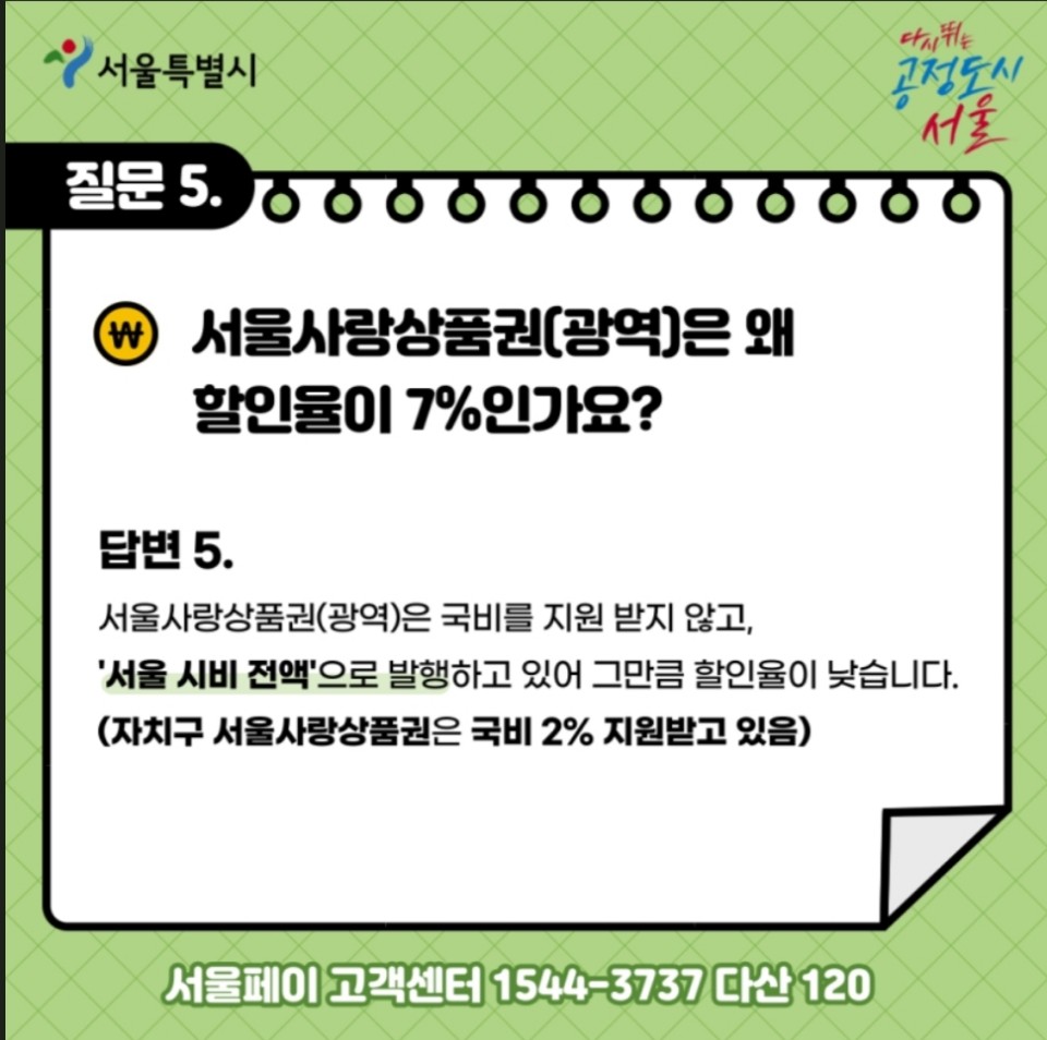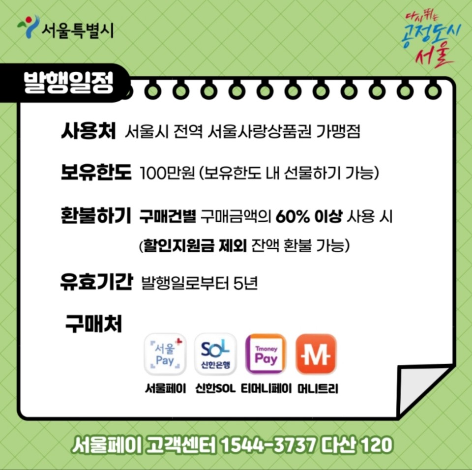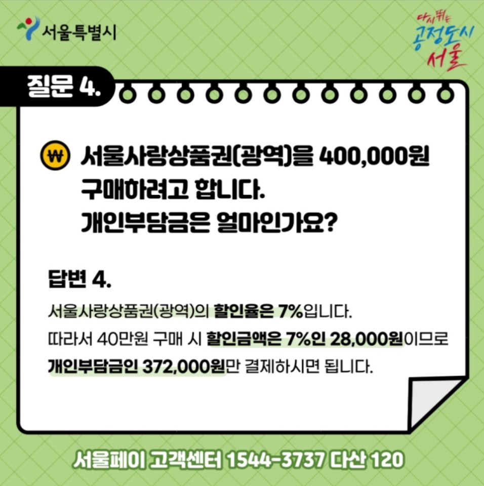 서울시 25개구 자치구 어디에서든 사용할 수 있으며 할인율은 7%, 구매한도는 40만원이며 보유한도 100만 원, 보유한도 내에서 선물하기 가능합니다.