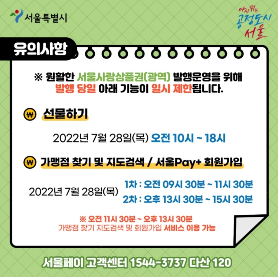 또한 서울사랑 상품권을 구매하고 싶었어도 1차 때 너무 많은 접속으로 인해 구매에 실패하셨던 분들이 많으셨으리라 생각됩니다. 그런 불편함을 없애기 위해서 서울시에서 서버 용량을 2뱁로 증설하기로 하였으며 초당 200건에서 1000건으로 5배로 늘렸다고 합니다. 서울사랑 상품권 구매 시 나타날 수 있는 오류가 나오지 않도록 시스템 또한 점검하였습니다.