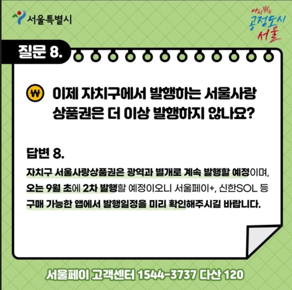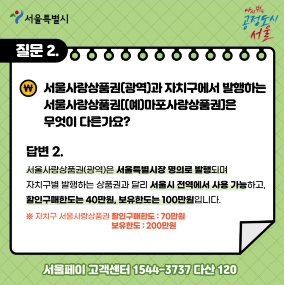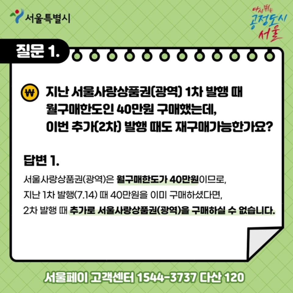 ※ 서울사랑 상품권은 월 구매 한도는 40만 원이며 1차 발행 때 40만 원을 구매하셨다면 2차 발행 때는 추가 구매가 불가합니다.