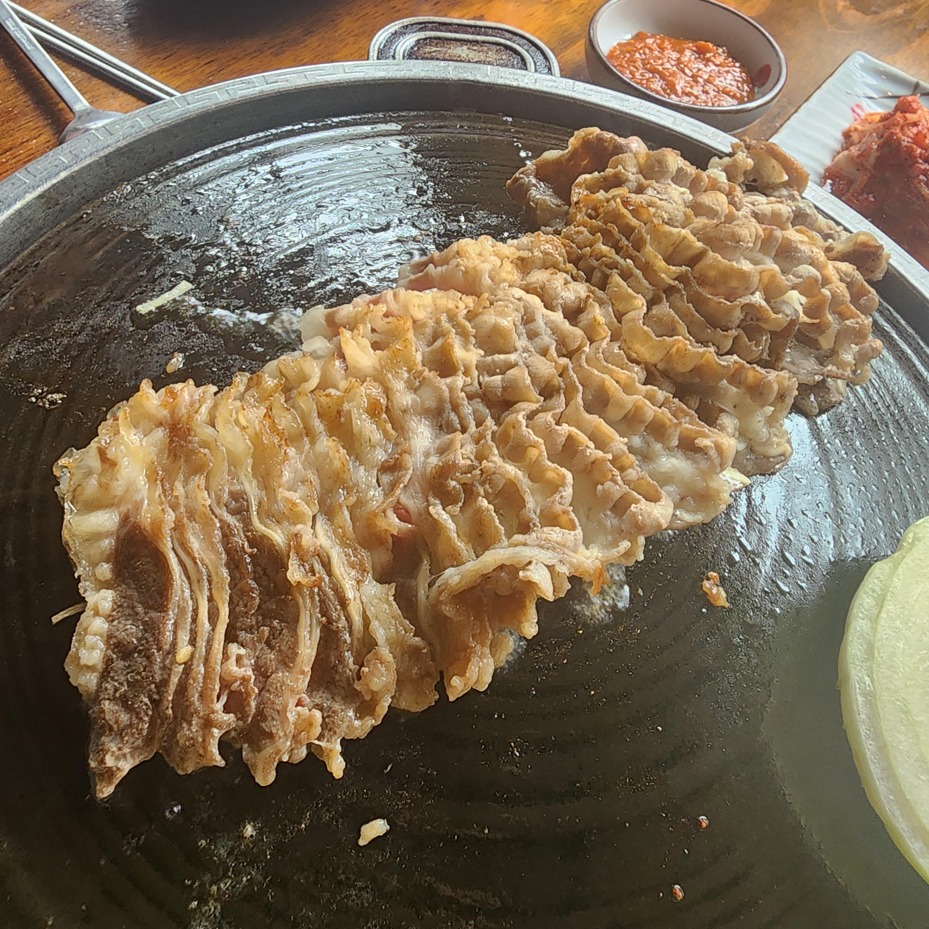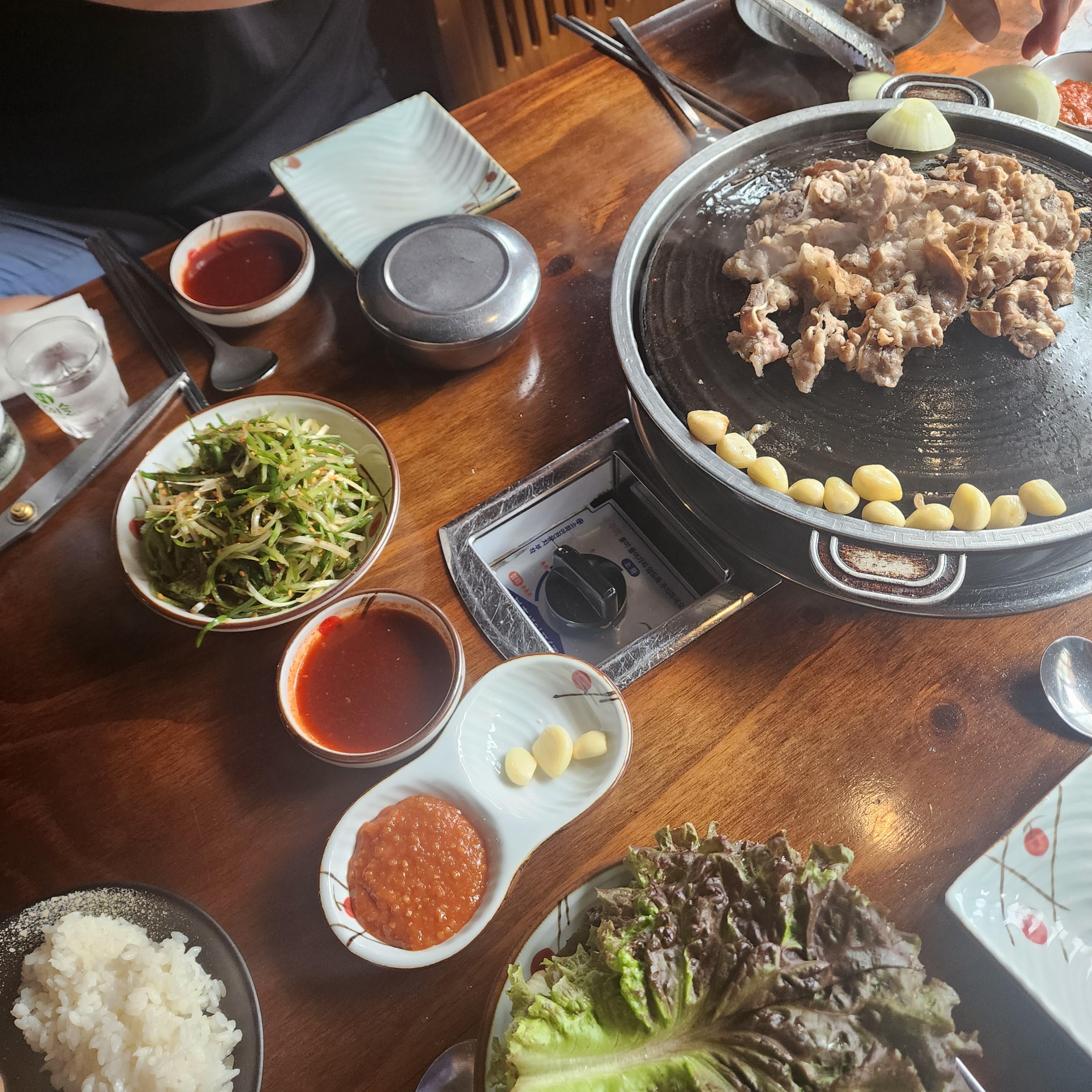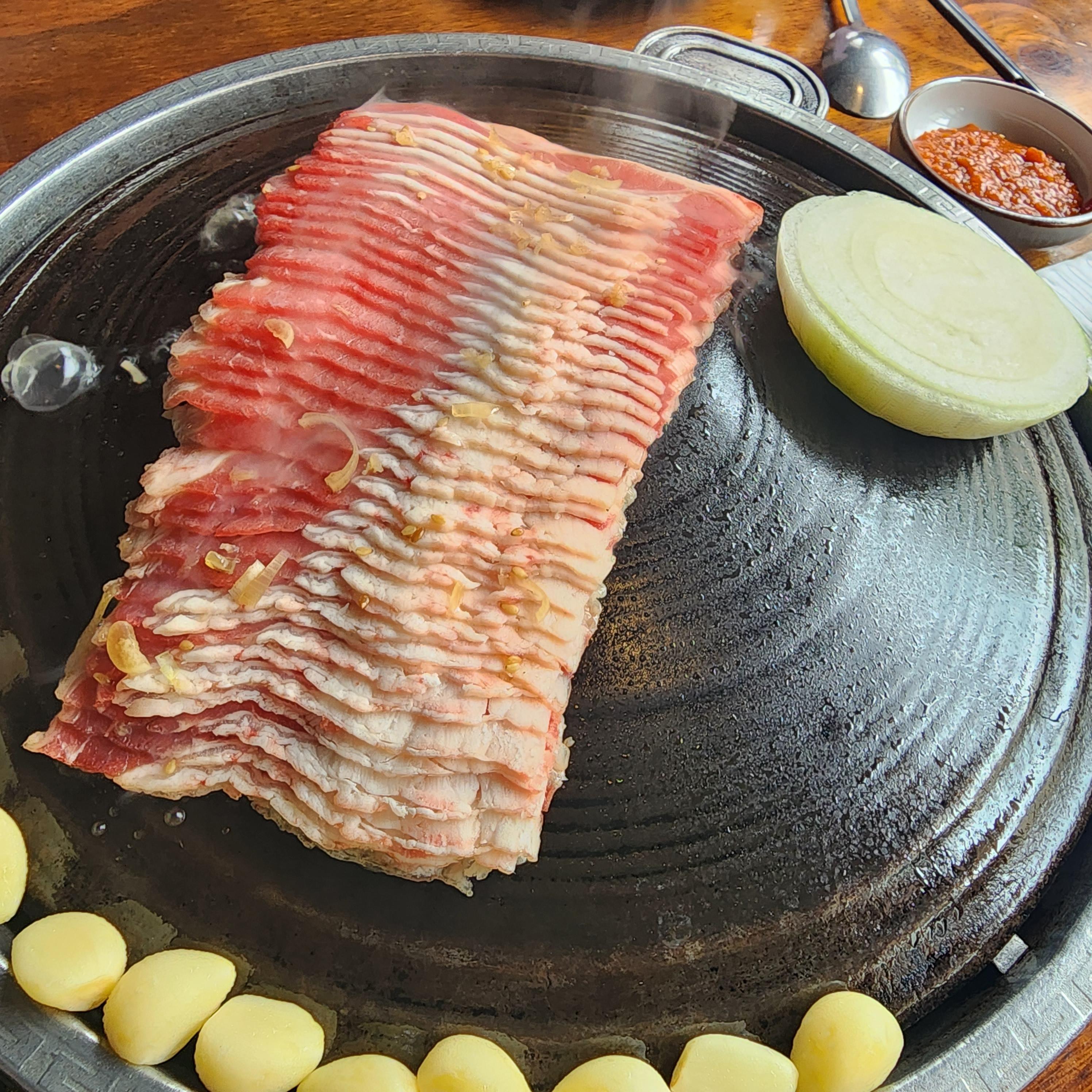 뒤쪽이 익었을쯤 싸악 뒤집어주니 꽃이 핀듯한 모양새네요. 기본으로 주시는 파절이와 우삼겹을 찍어 먹을수 있는 소스, 야채와 된장 단촐 하긴합니다.