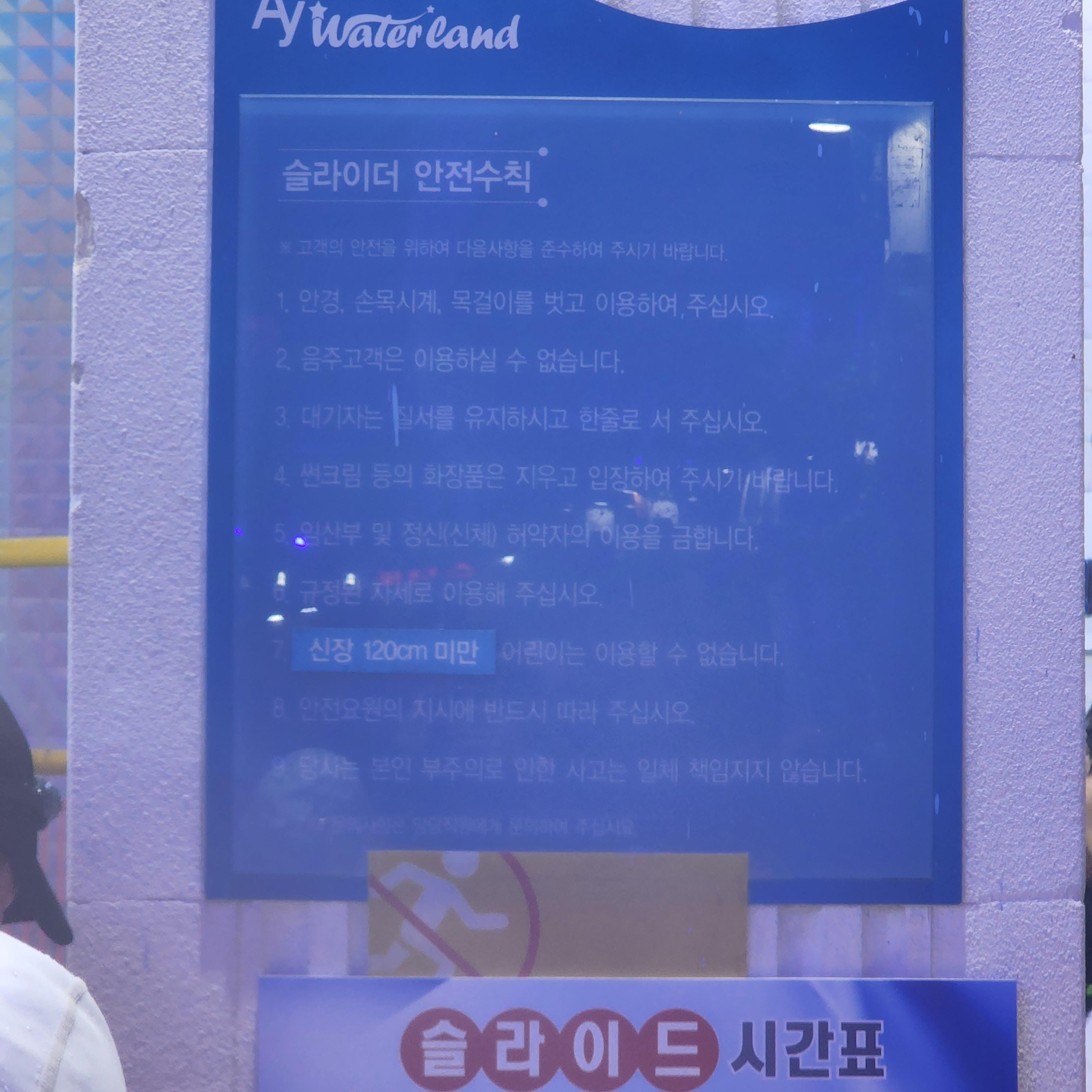 한쪽에는 슬라이더도 두가지 준비돼있었는데 매 정시마다 25분씩 운영되고 있었습니다. 신장은 120cm 미만은 탑승할 수 없으며 구명조끼를 착용하고 탈 수는 없습니다. 또한 장신구들을 하고 탈 수 없는데 안경을 쓰신 분들은 벗고 타셔야 합니다. 저는 슬라이드 중에 노란색으로 바로 뚝떨어지는 슬라이드를 탑승하였는데요. 스릴감이 있지만 좀 어린 학생들에게는 많이 무서울 것이라 생각되더군요. 슬라이드를 타고 내려왔을 때 물에 빠지게 되는데 물이 그리 깊지 않아서 엉덩방아를 찧을 수 있으니 조심하셔야 합니다.