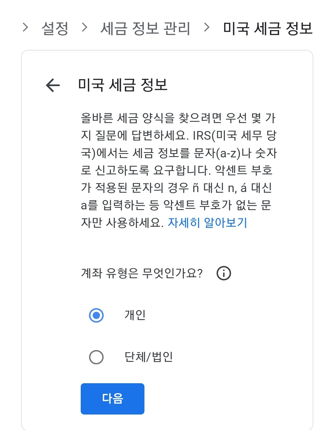 우선 전 단체/법인이 아닌 개인이기 때문에 개인으로 설정후 다음을 눌러 주었습니다.
