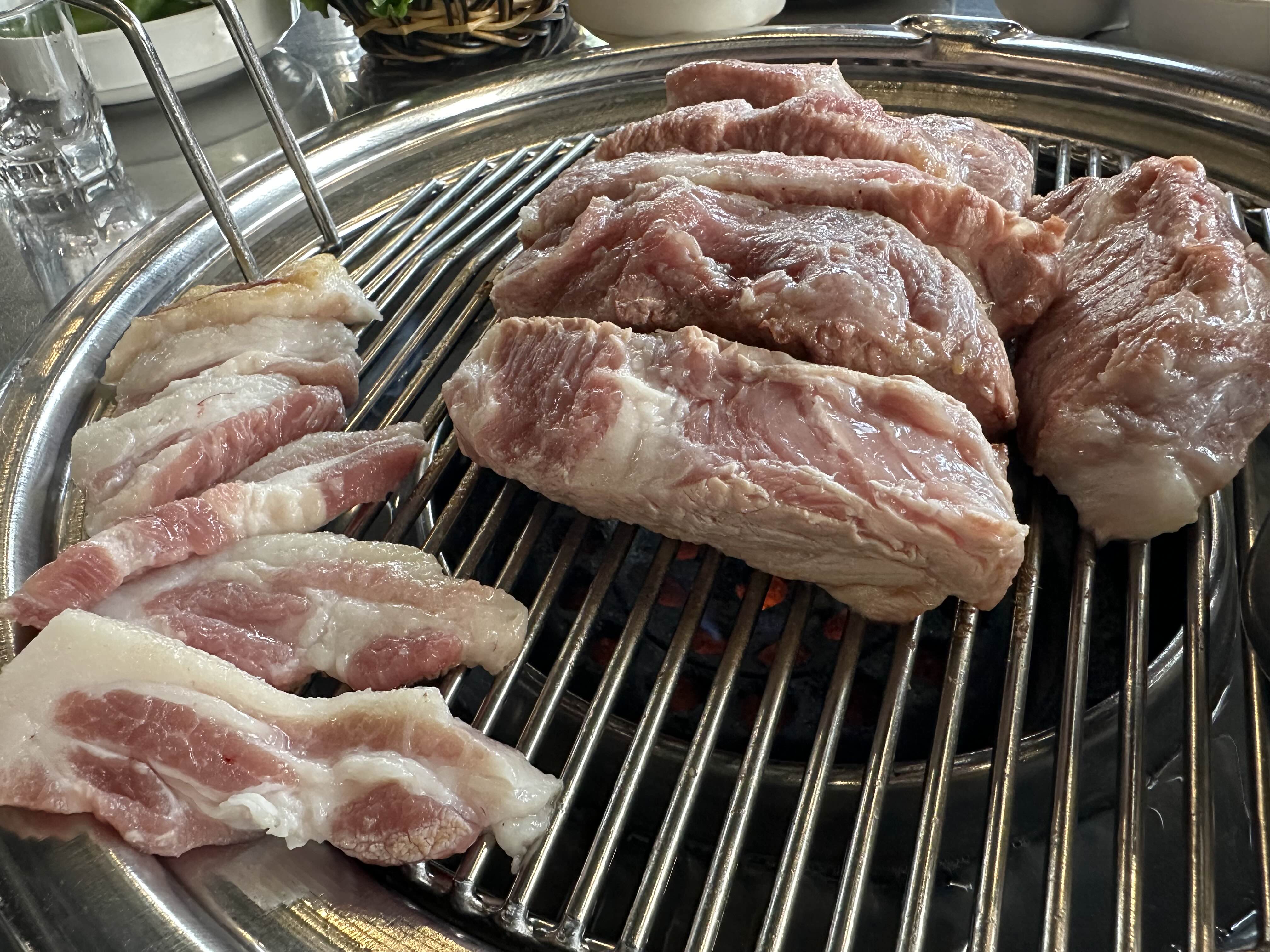제주돈사돈은 이름 그대로 제주산 돼지고기를 화덕에 구워내는 곳이에요. 고기 종류는 목살과 삼겹살이 있는데, 이날은 아이들도 편하게 먹을 수 있도록 전부 목살로만 주문했습니다. 처음에는 600g씩 두 테이블로 나눠 주문했고, 먹는 내내 고기가 너무 맛있어서 결국 600g을 더 추가했답니다. 총 1800g을 폭풍 흡입했어요!