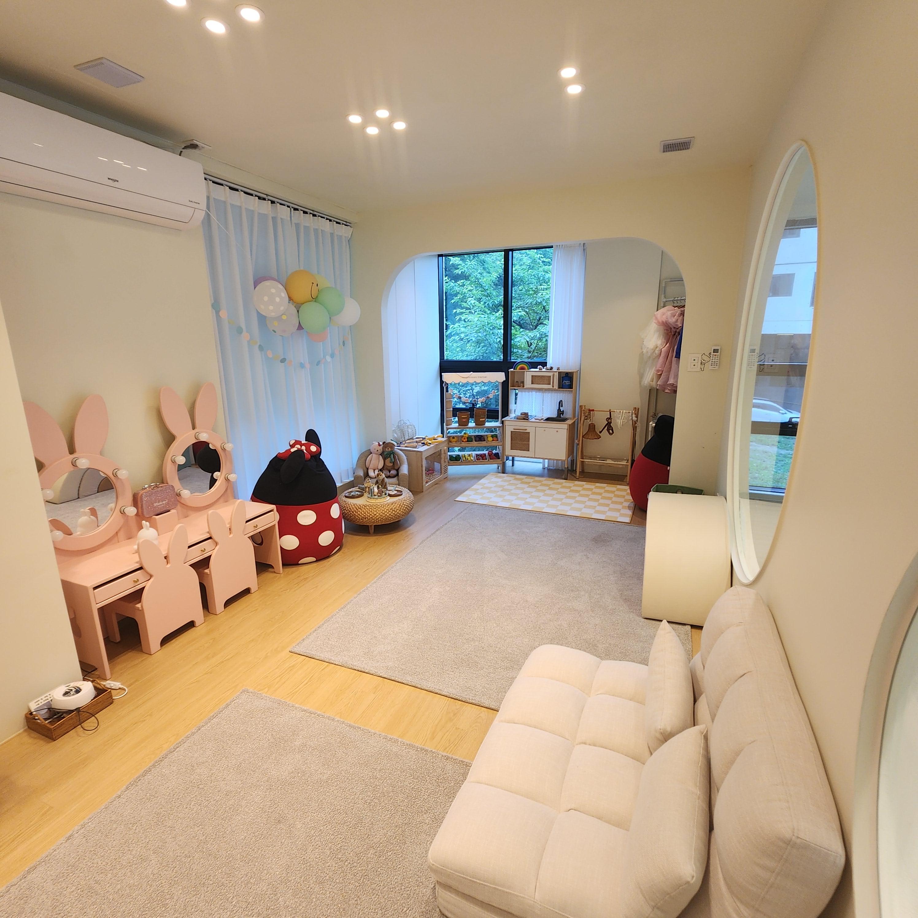 여자 아이들이 좋아하는 드레스와 화장대가 준비되어 있고 장난감들이 비치되어 있었습니다.