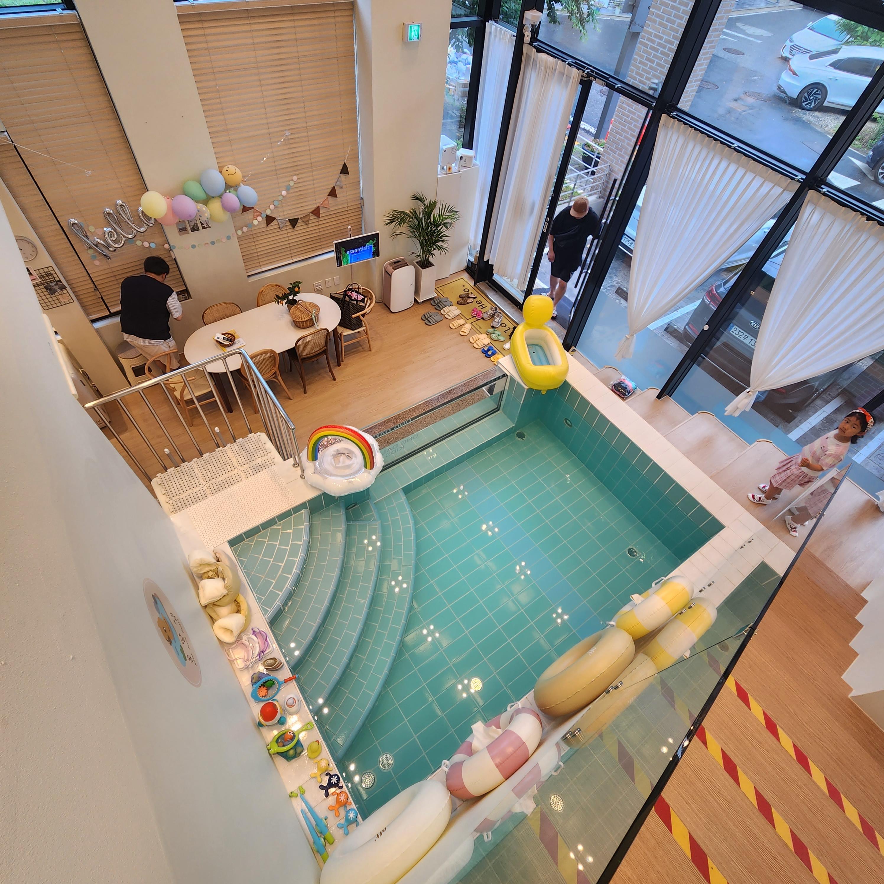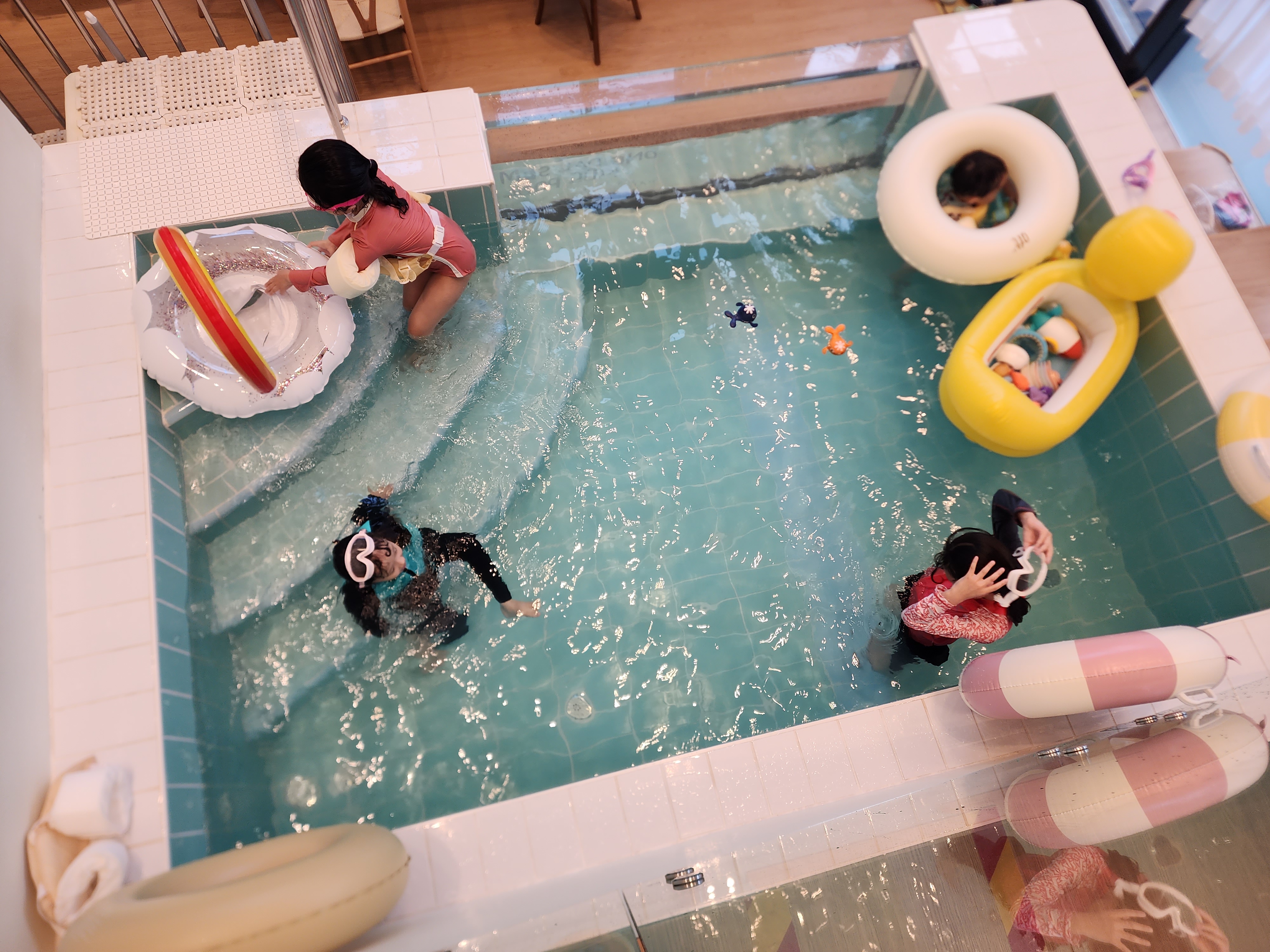 아이들이 놀 수 있는 장난감들과 구명조끼 튜브들이 준비되어있고 풀장 깊이도 아주 깊지 않아 제일 작은 5살(97cm)