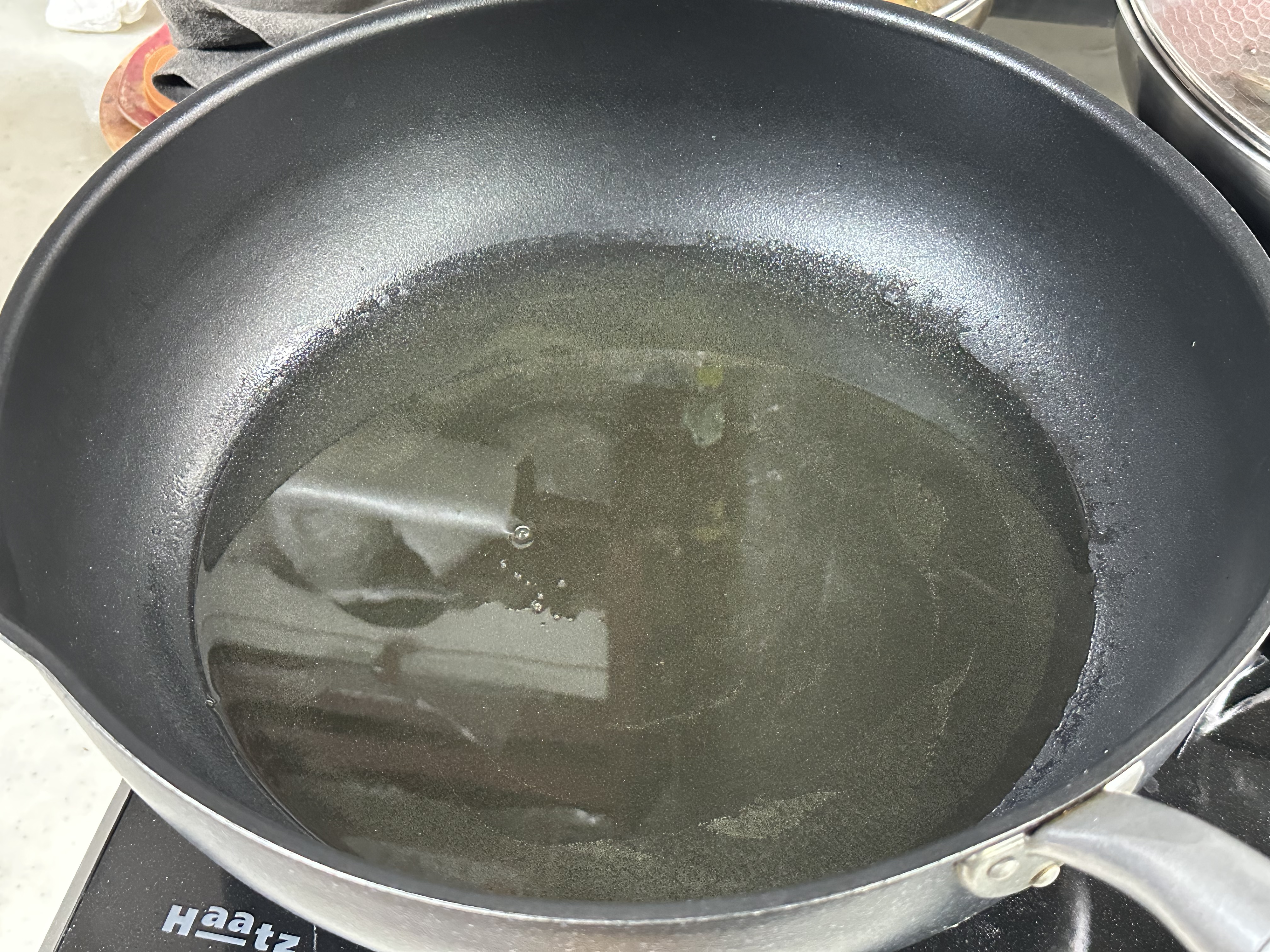 3. 웍에 두부가 잠길 만큼 기름을 붓고, 양파 1개를 넣어 기름 냄새를 잡아줍니다.