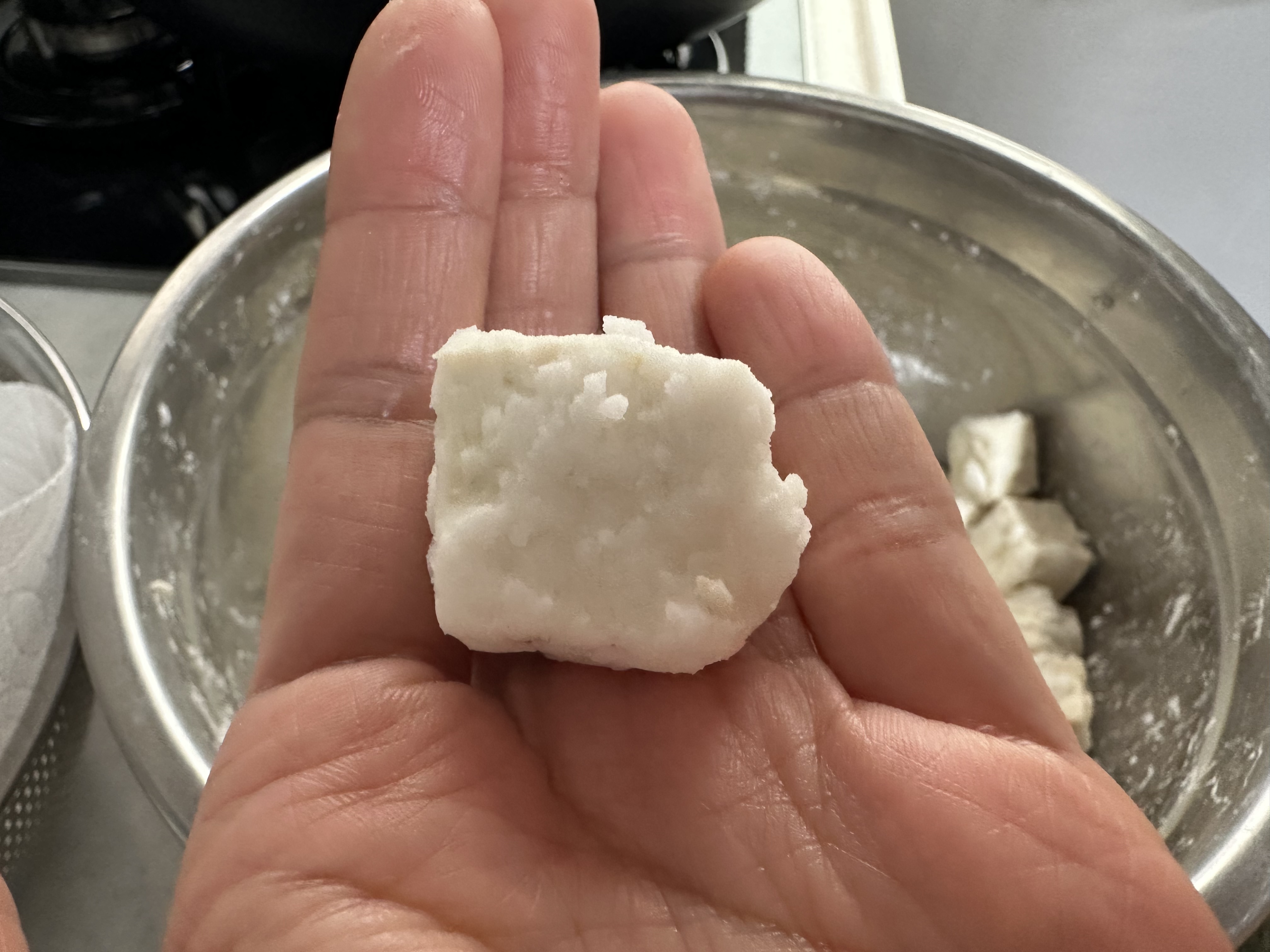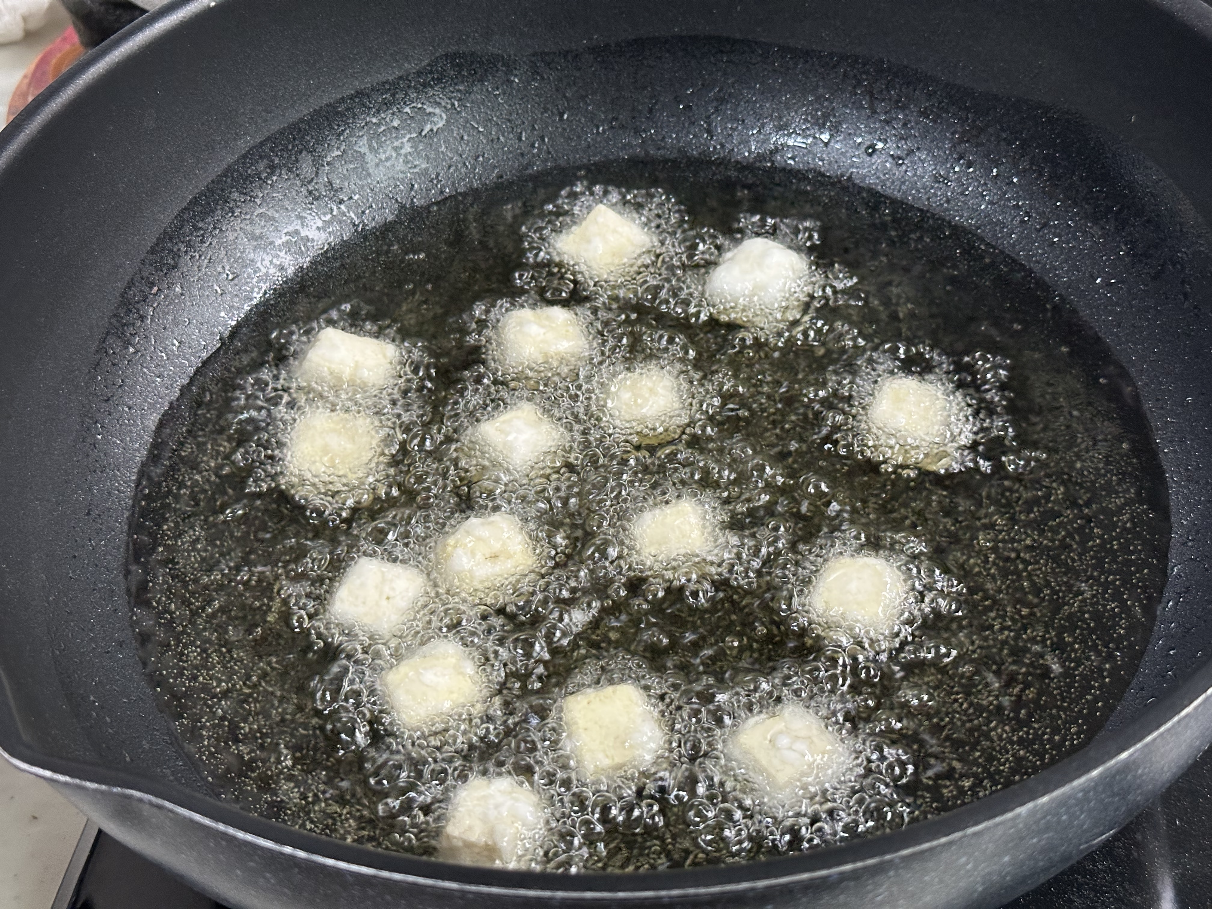 - 기름이 충분히 달궈지면, 두부를 하나씩 떨어뜨리듯 넣어주세요. 달라붙지 않도록 조심스럽게요.