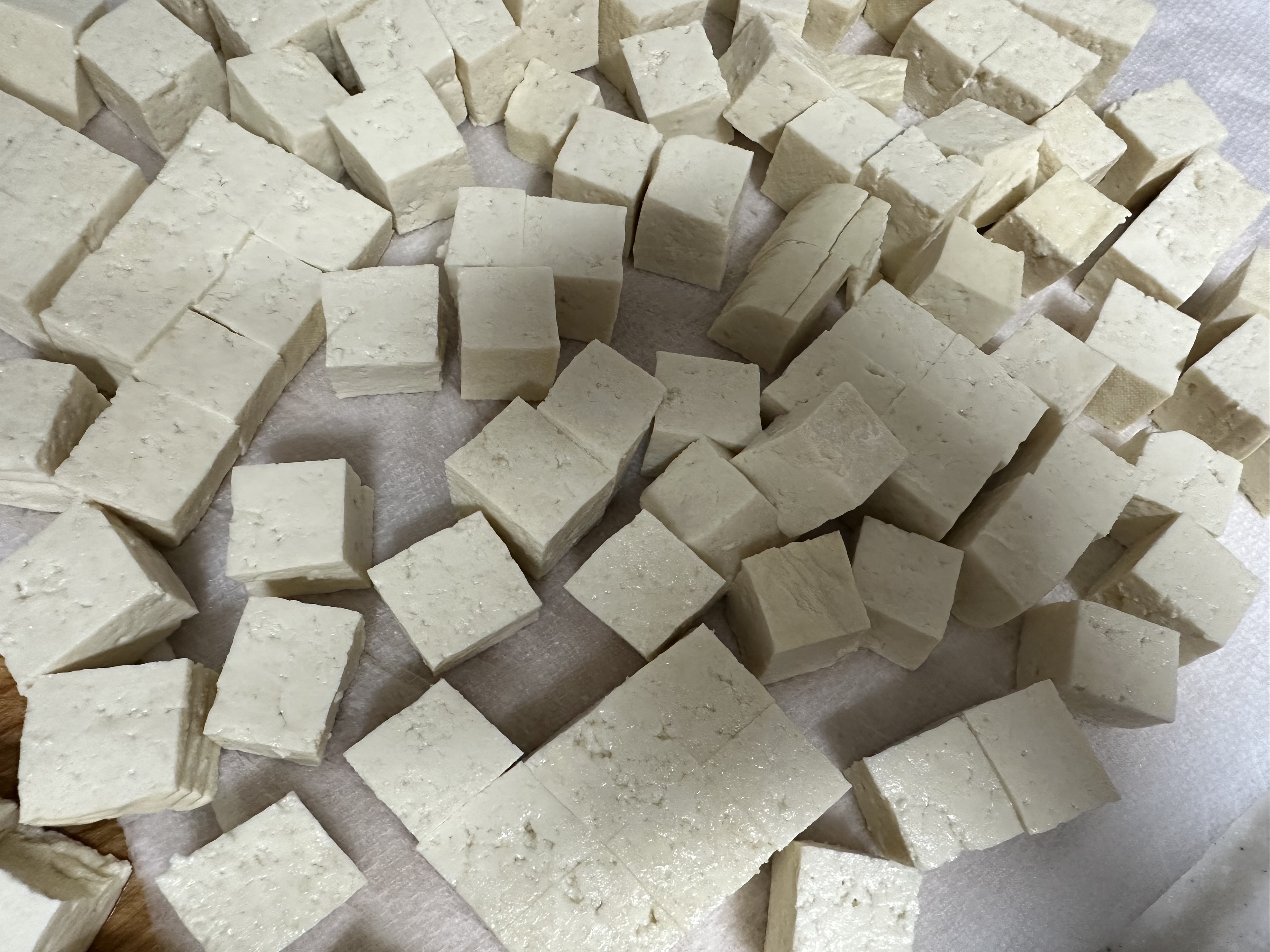 - 도마 위에 키친타올을 깔고, 썰어 놓은 두부의 물기를 충분히 제거해주세요.