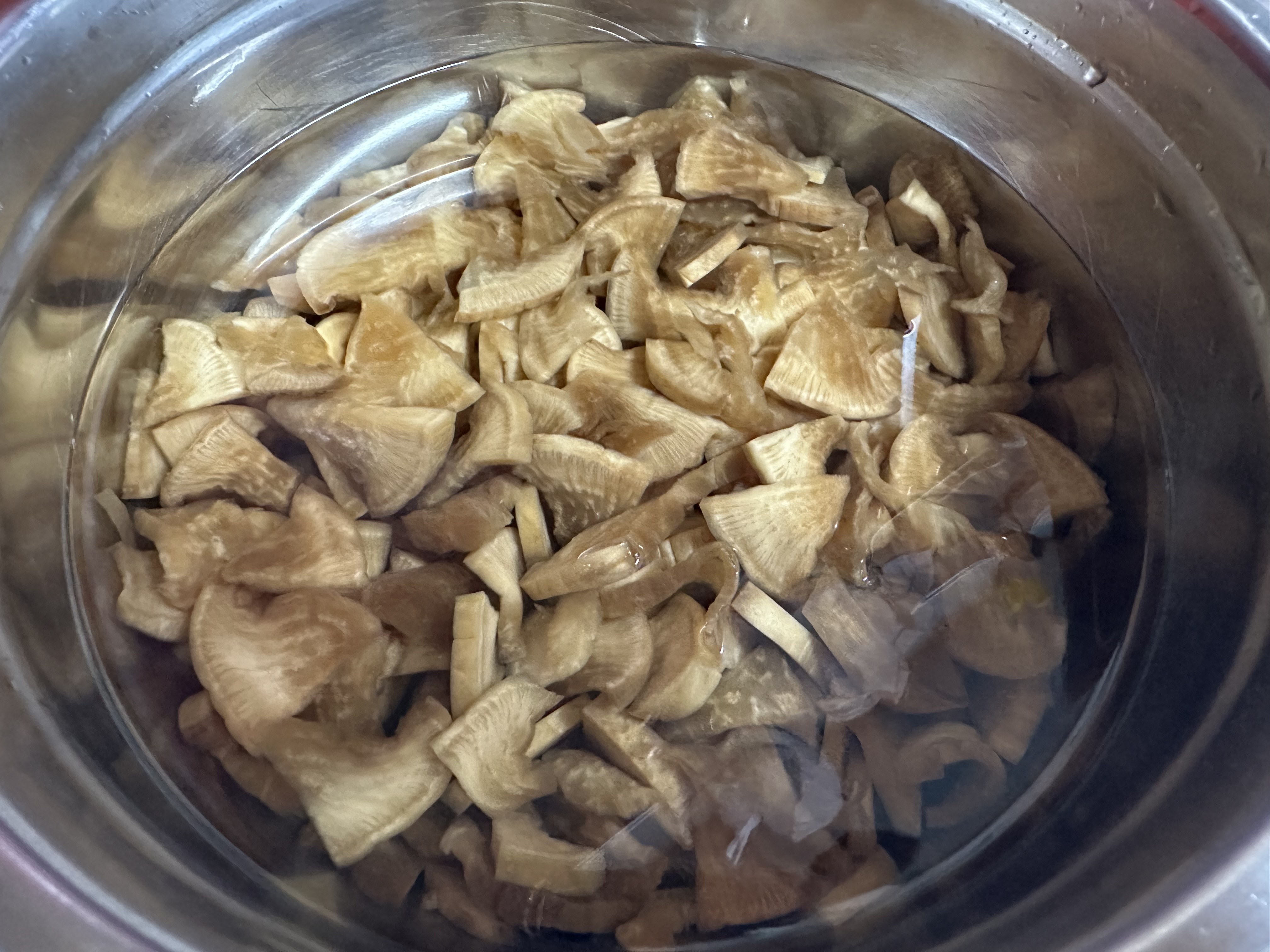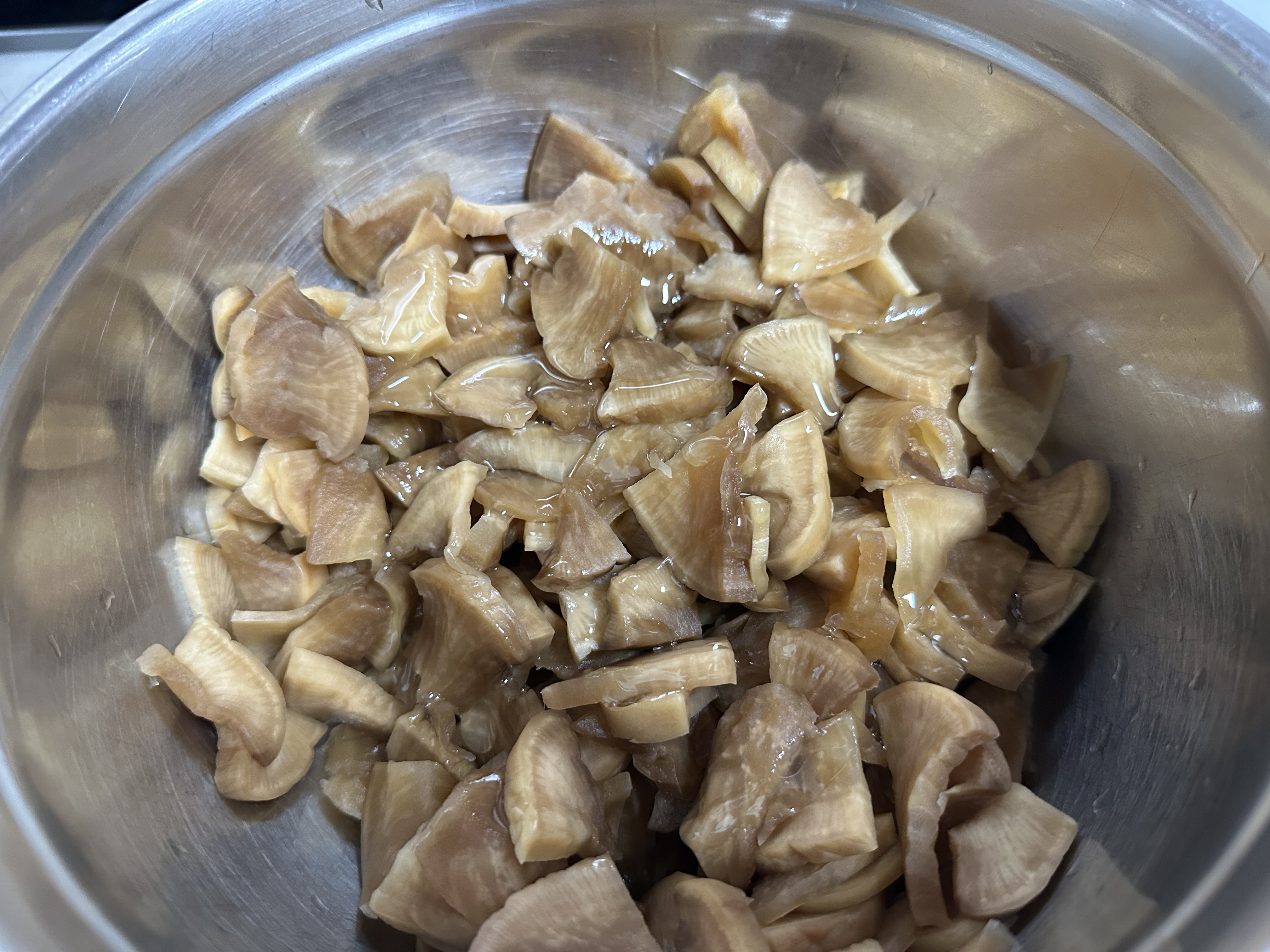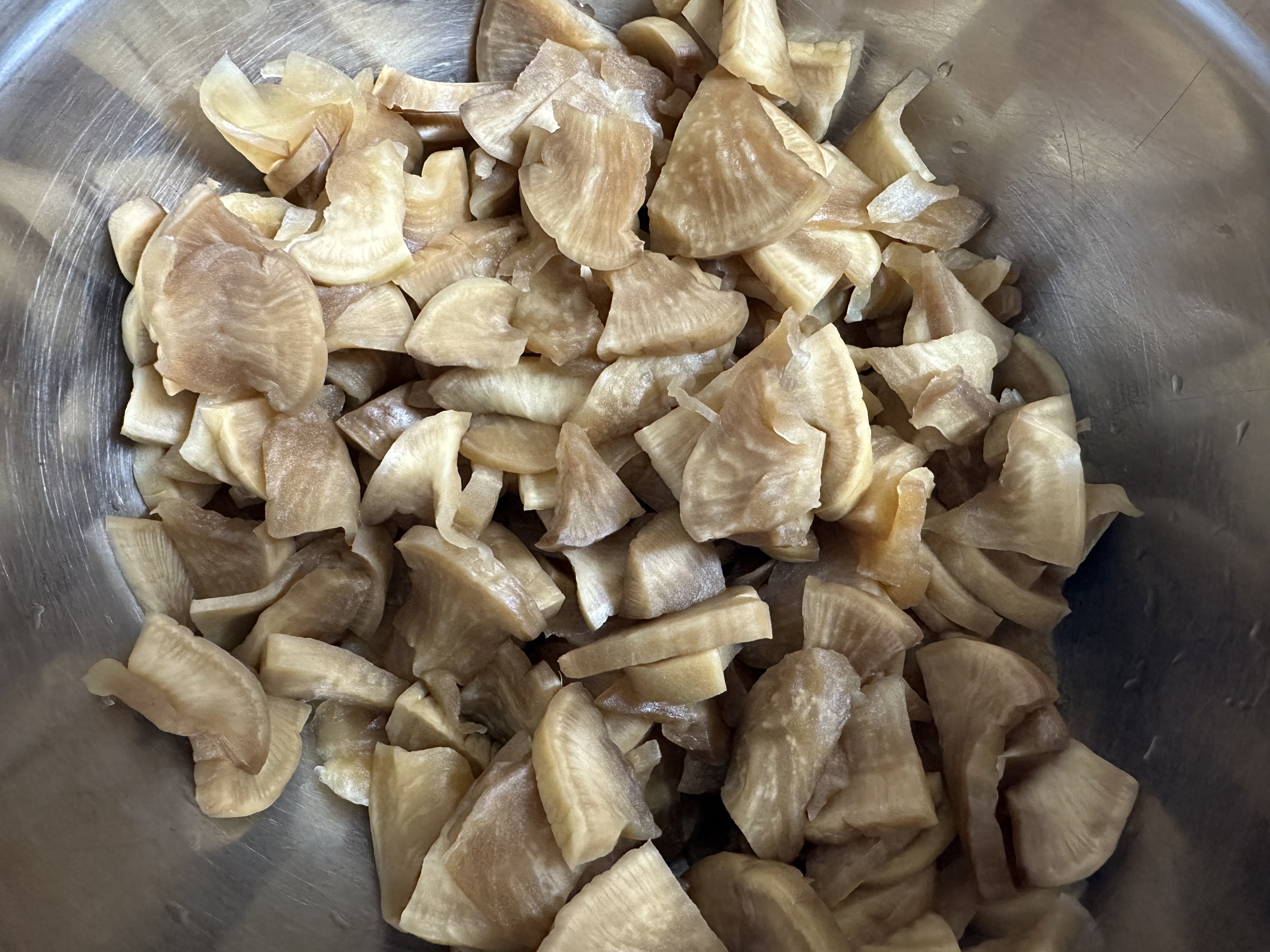 짠지무 절이기: 먼저 짠지무를 먹기 좋은 크기로 잘라줍니다. 짠맛을 빼기 위해 찬물에 20~30분 정도 담가주세요.