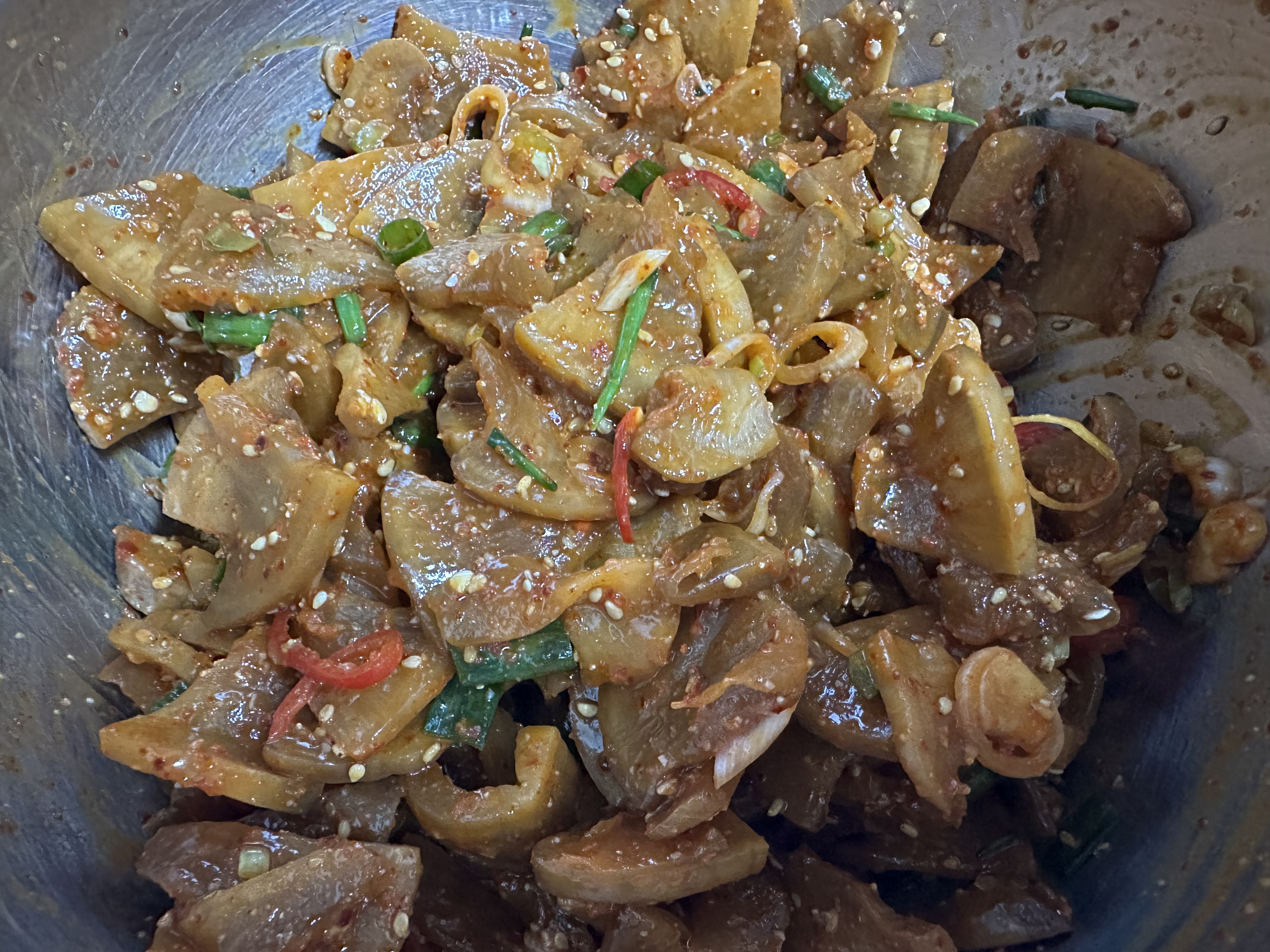 양념과 버무리기: 준비한 짠지무에 물엿 2숟갈, 고춧가루 1숟갈 반, 채 썬 홍고추와 쪽파를 모두 넣고 조물조물 버무려줍니다. 간을 한 번 보고, 짠맛과 단맛은 입맛에 맞게 조절해 주세요.