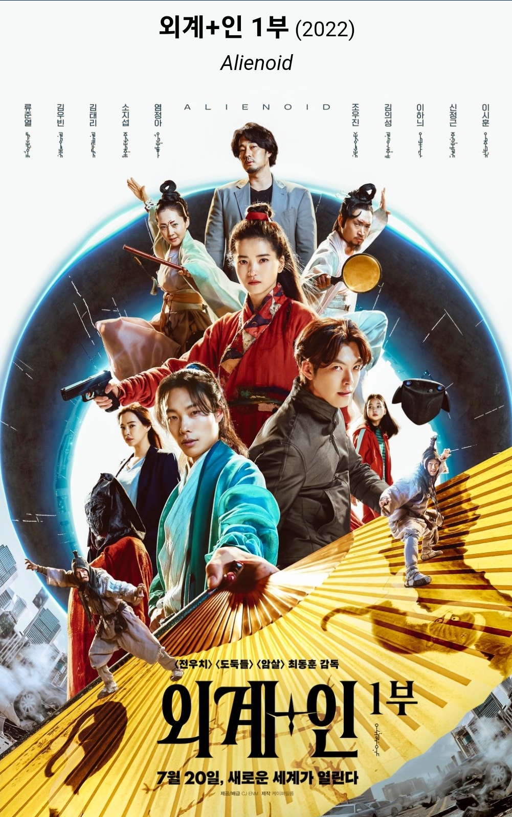 2022년 7월 20일에 개봉한 외계인 1부는 외계인들에 의해 사람의 몸속에 갇혀있는 외계인 죄수들을 쫒게 되고 신검을 차지하려는 도사들과 2022년 사람에 의해 시간의 문이 열리며 벌어지는 액션 판타지 영화입니다. 1부와 2부로 나누어 있는 영화이며 '도둑들'과 '암살'의 연출과 각본의 최동훈 감독이 맡아 화제가 되기도 했습니다. 7년 만의 복귀 작품이기에 관심 또한 많습니다.