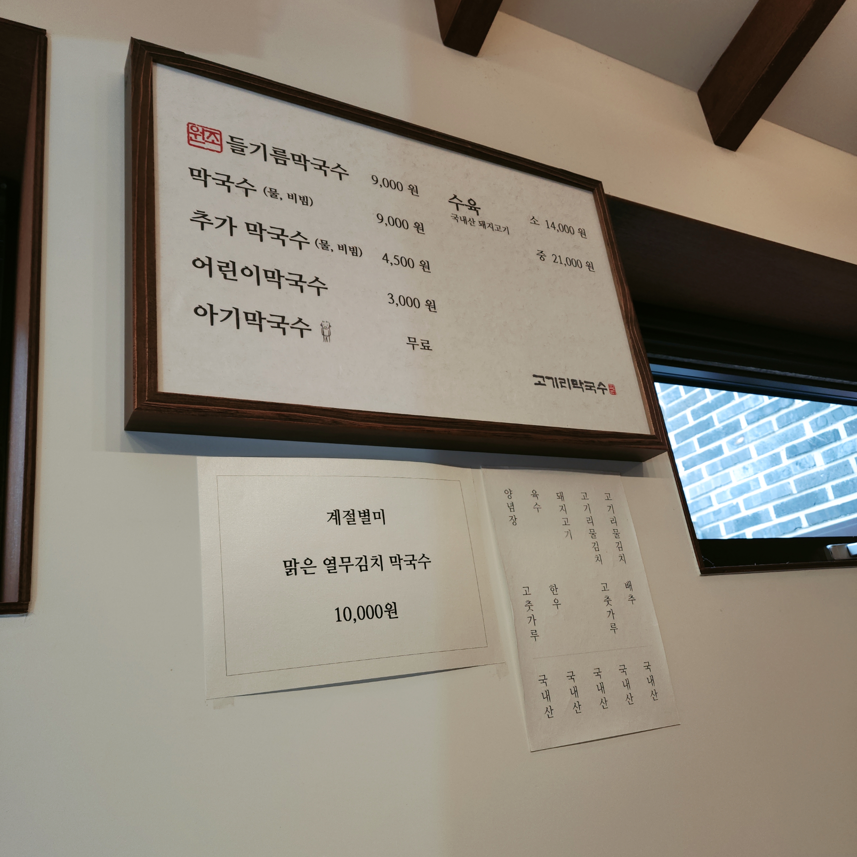 요즘 물가가 워낙 상승하고 있다 보니 고기리 막국수도 가격이 올랐더군요. 이전 메뉴판에는 들기름 막국수가 표시되어 있지 않았는데 이제는 대표 메뉴로 표시되어 있더군요. 추가 메뉴는 물국수와 비빔국수만 가능하니 꼭 확인하시는 게 좋습니다.