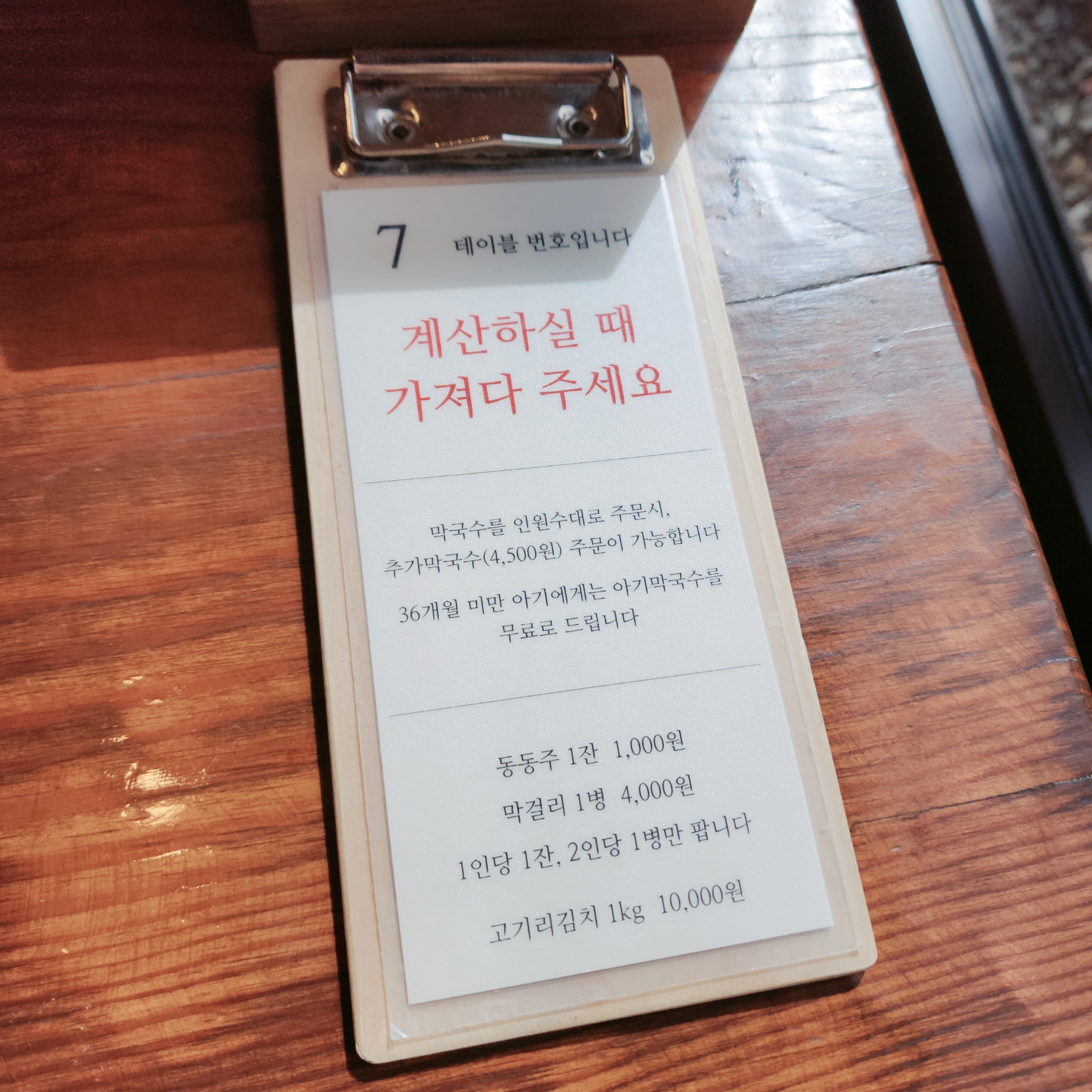 계산하실 때는 테이블 번호 빌지를 가지고 가시면 됩니다. 김치를 사고 싶으시거나 오뚝이에서 나온 고기리 막국수를 구매하실 때도 앞에 계산대에서 하시면 됩니다. 그리고 알아보니 고기리 막국수에서 막국수를 구매할 때는 육수를 하나 서비스 주시곤 하는데 오뚜기몰에 들어가면 육수를 개인적으로 추가 구매를 할 수 있더군요. 집에서 만들어 드실 때 육수를 구매해서 먹으면 비슷하지 않을까 싶습니다.