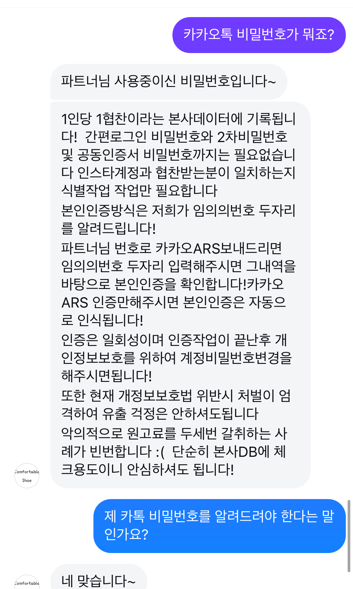 다시 되물어도 돌아오는 대답은 카카오톡 비밀번호가 맞다네요? 협찬 받는데 카카오톡 비밀번호가 필요 했던가