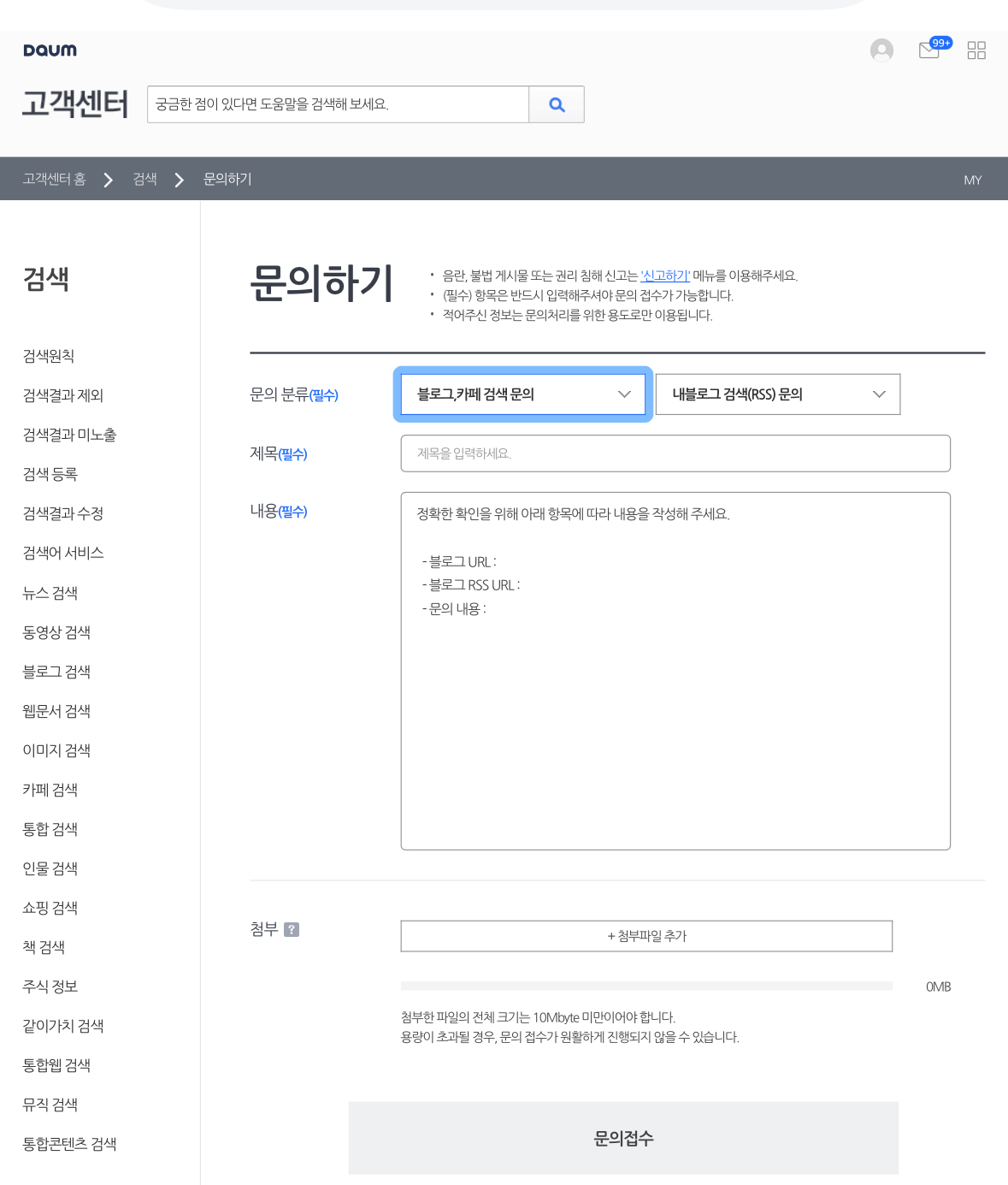 다음 고객센터에 들어간다 >검색결과> 미노출 선택> 문의하기
