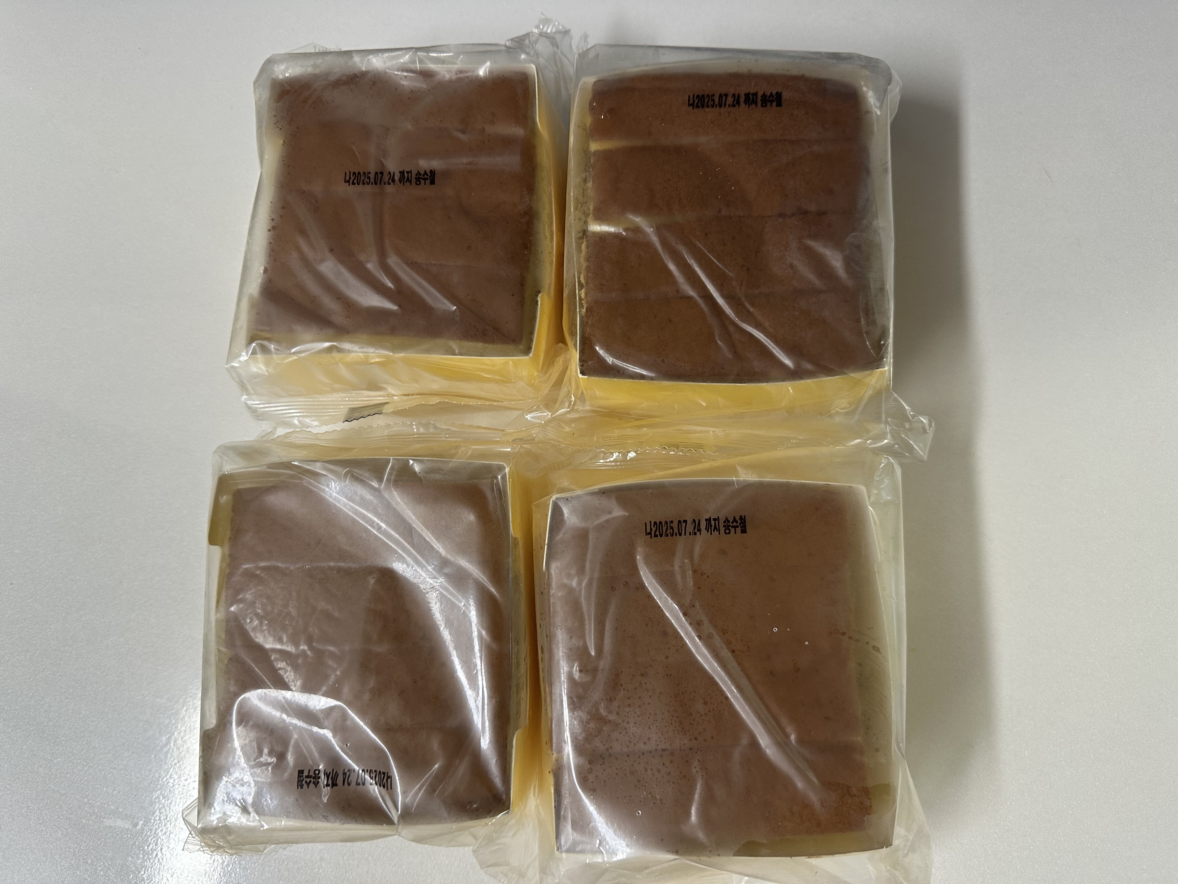 각 봉지마다 잘라진 카스테라 조각 4개가 들어 있어요.