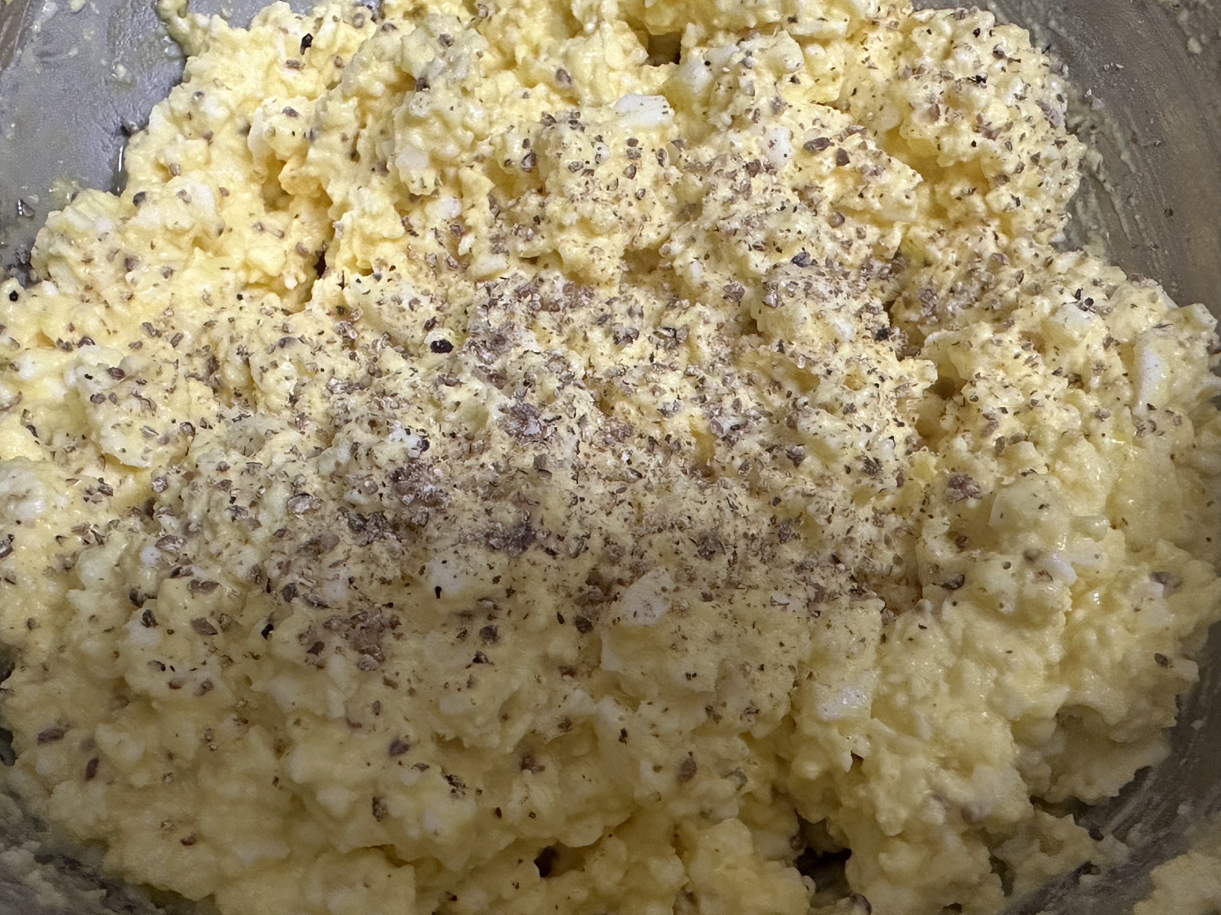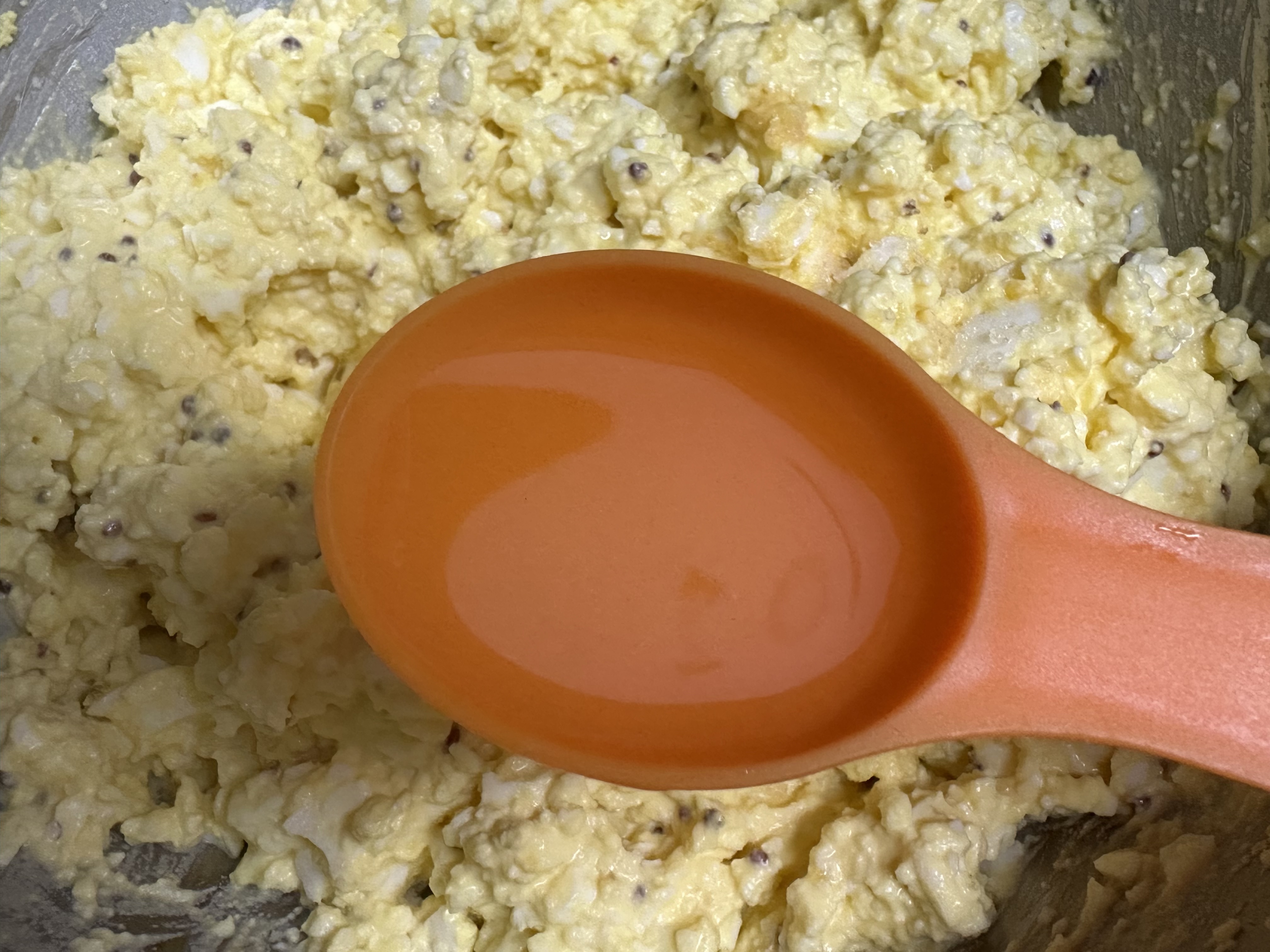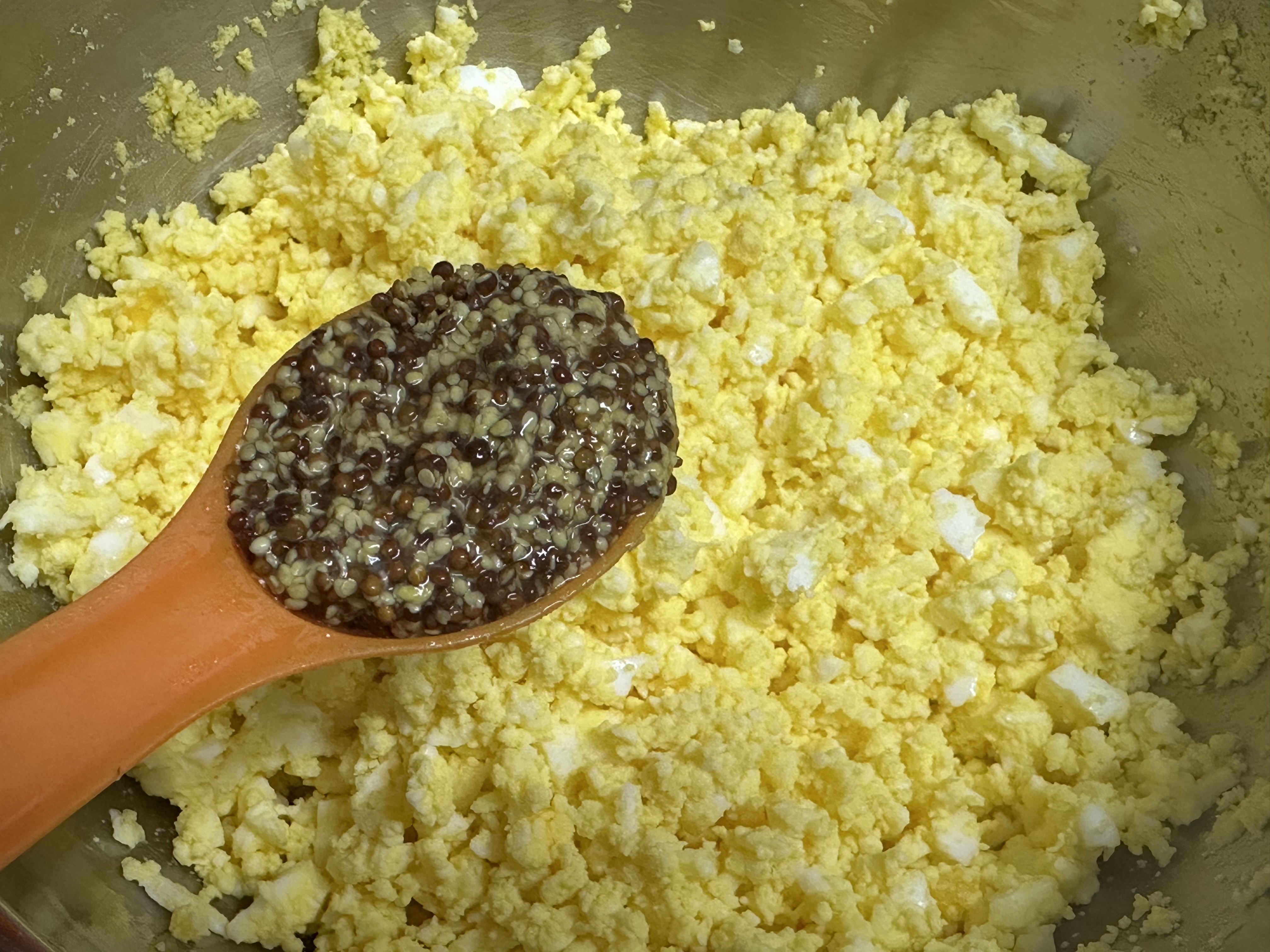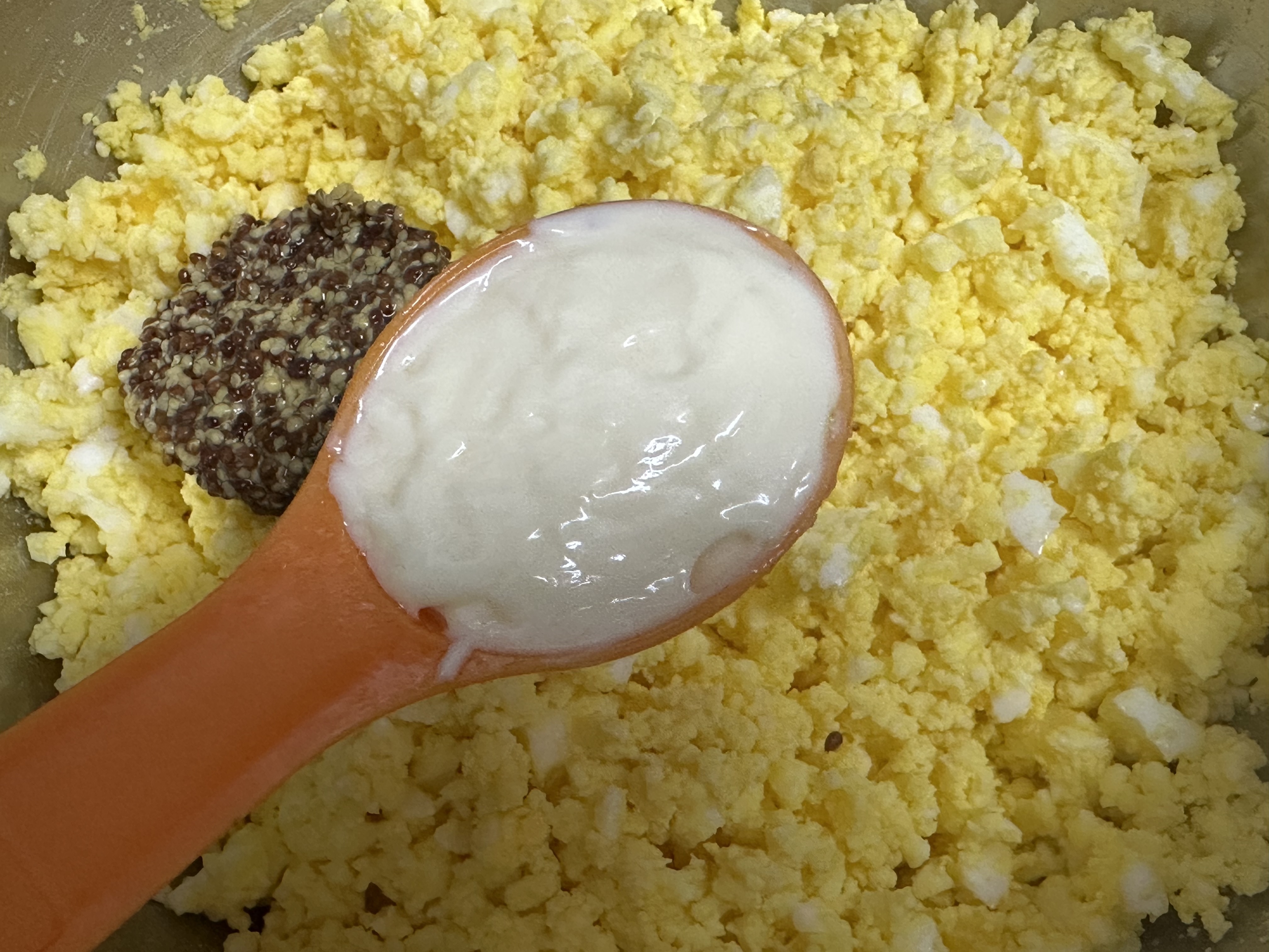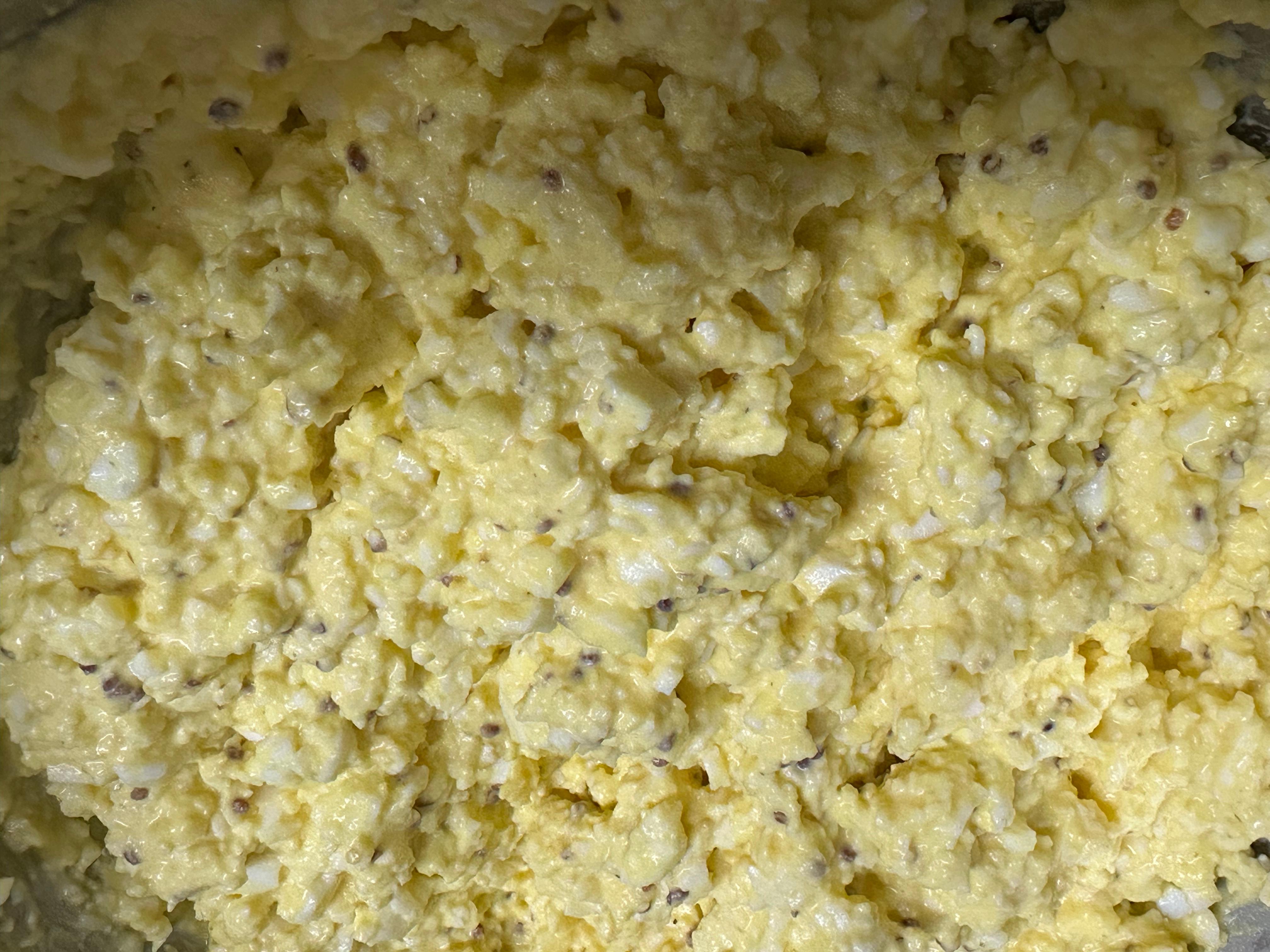 삶은 달걀을 포크로 으깨고, 마요네즈6큰술 , 꿀 2큰술, 씨 머스타드 1큰술, 소금, 후추를 넣고 잘 섞습니다.