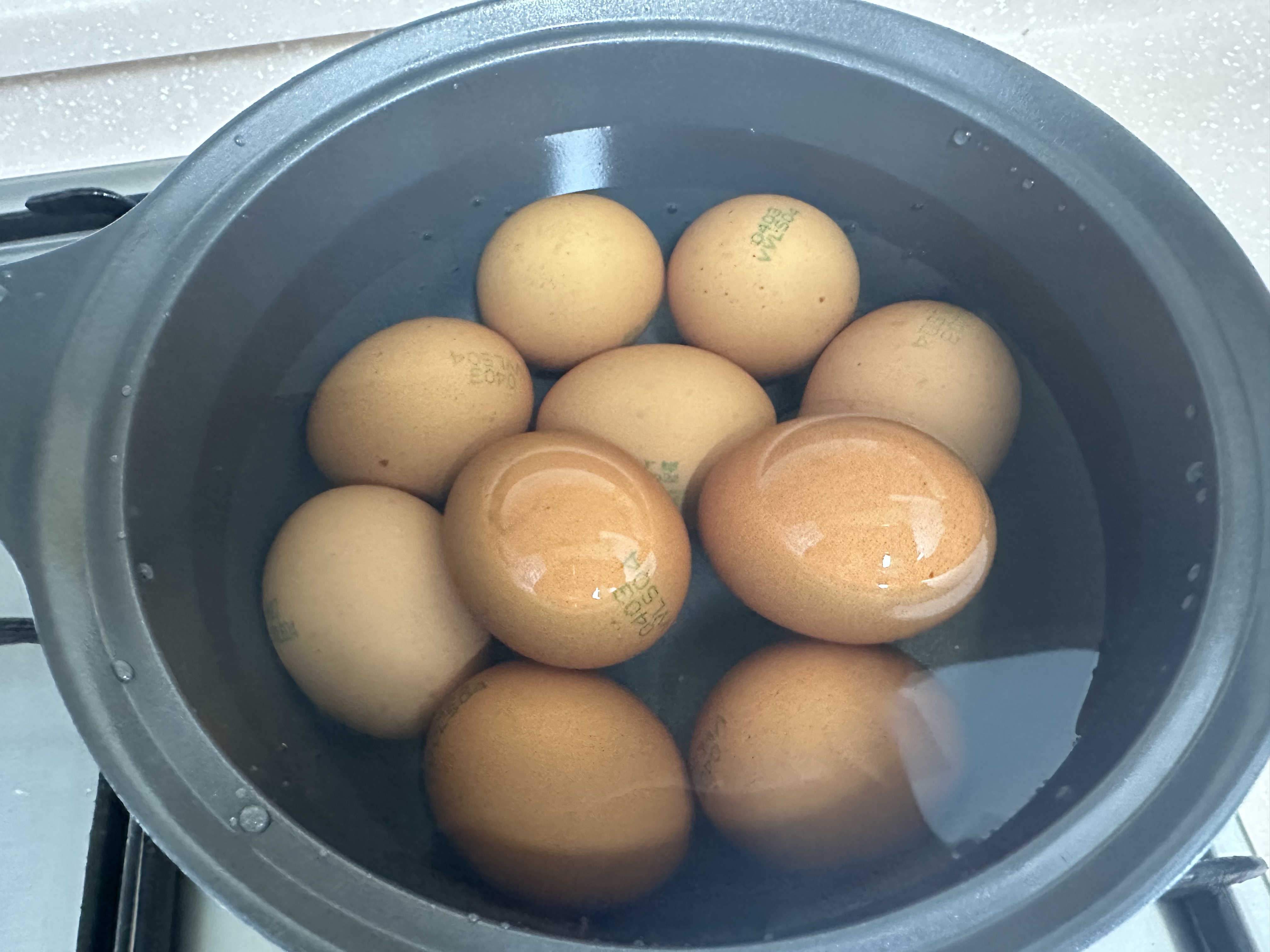 미지근해진 달걀은 냄비에 물을 붓고 달걀을 넣은 뒤, 물이 끓으면 약 7-8분 정도 삶아줍니다.