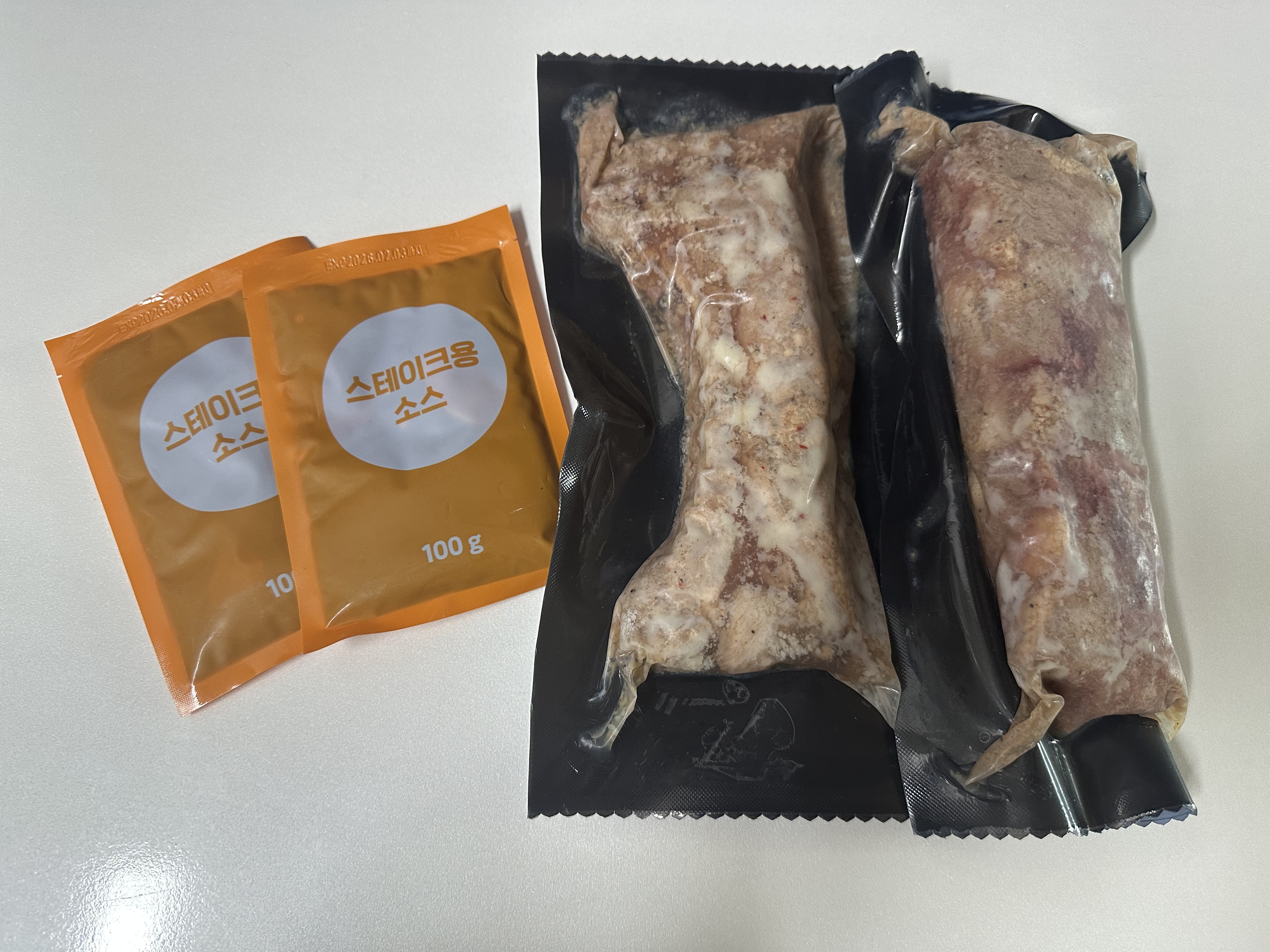 먼저, 메인 메뉴인 코스트코 한돈수비드 우대갈비 스테이크는 이미 저온 수비드로 익혀져 있기 때문에 겉면만 바삭하게 구워주면 되는 제품이에요. 도톰한 고기 두께와 뼈가 붙어 있어 보기만 해도 근사했고, 고기 특유의 잡내 없이 담백하고 촉촉했어요.