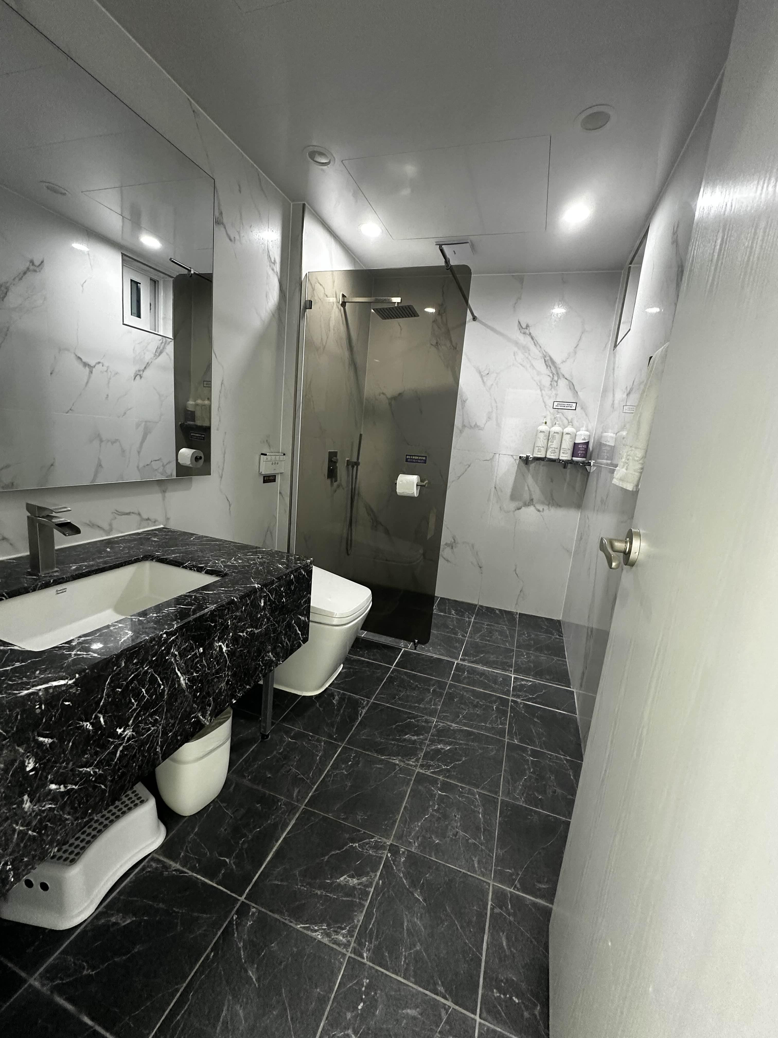입구에서 들어오자마자 있는 화장실은 여러명이 사용할 수 있는 공간이라서 그런지 굉장히 컸습니다. 화장실마다 비데가 설치 되어있었고 아이들 전용 샴푸&바디 어른들이 함께 사용할 샴푸,린스,바디워시가 준비되어 있네요.