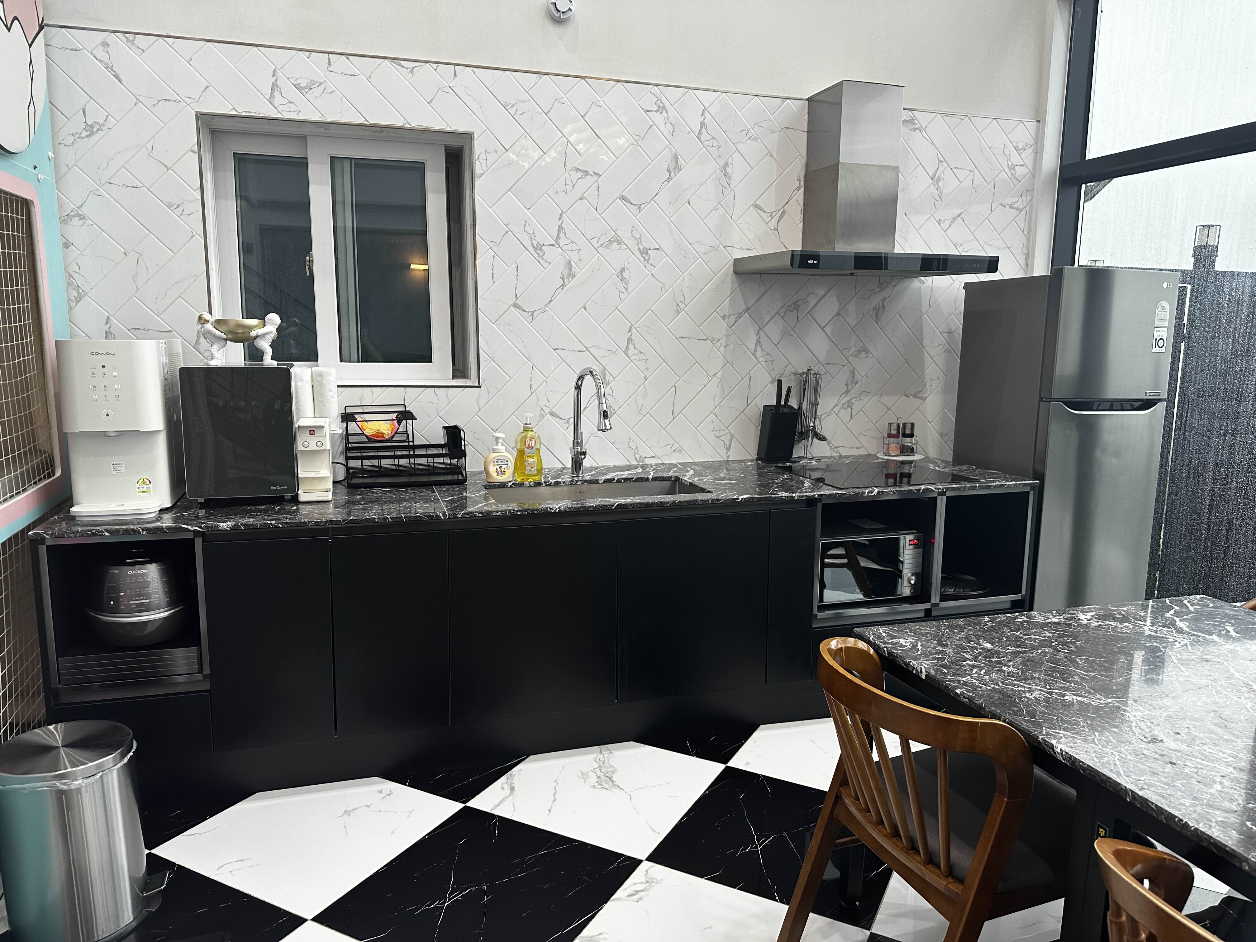 주방은 고기를 구워 먹을수 있는 식탁과 정수기, 인덕션, 커피머신,소독기,전자렌지,냉장고가 있습니다. 사실 여행을 여러집에서 오다보명 장을 봐오기 때문에 냉장식품 또는 냉동식품이 상당한데 냉장고가 많이 작네요. 겨우겨우 쑤셔서 넣었다는 슬픈 사실이…