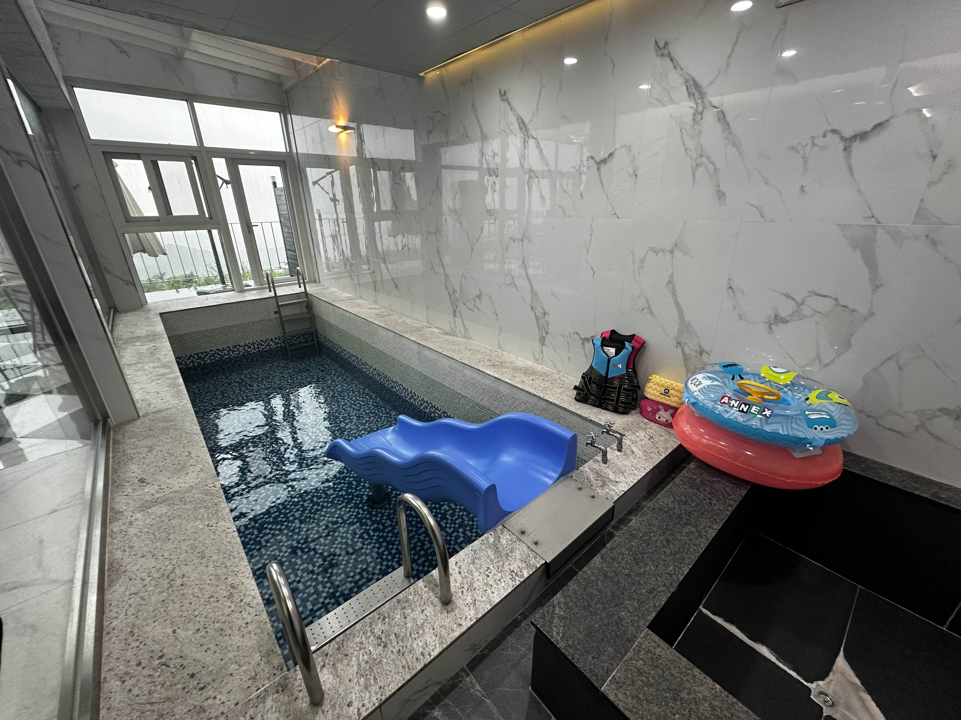 수영장의 물높이는 85cm정도 된다고 이야기를 들었던지라 막내 키가 104cm정도 인지라 막내가 놀기에만 적당 하겠네~생각했는데 보통 키즈펜션의 물높이는 이정도 된다고 하시더라구요.