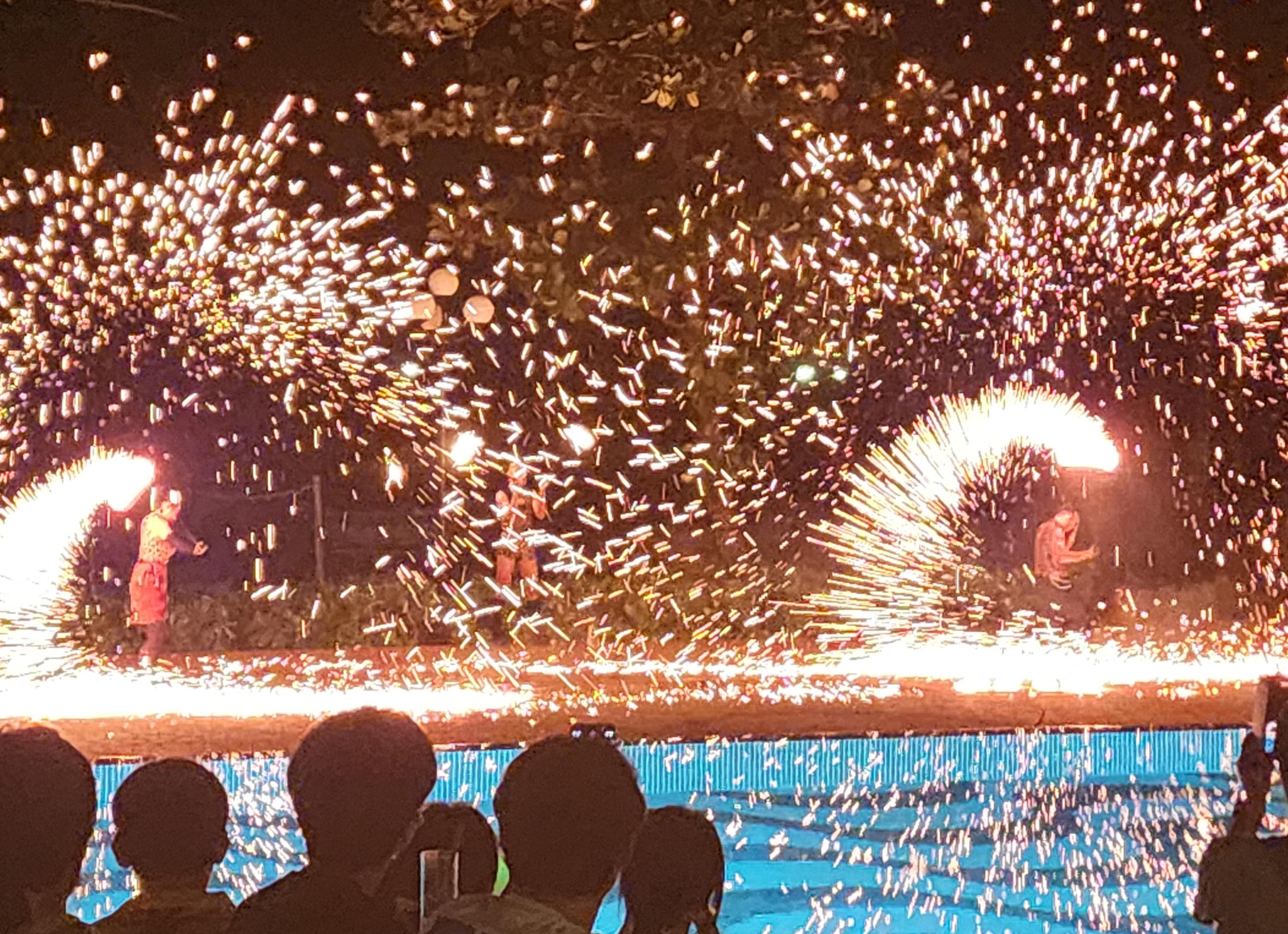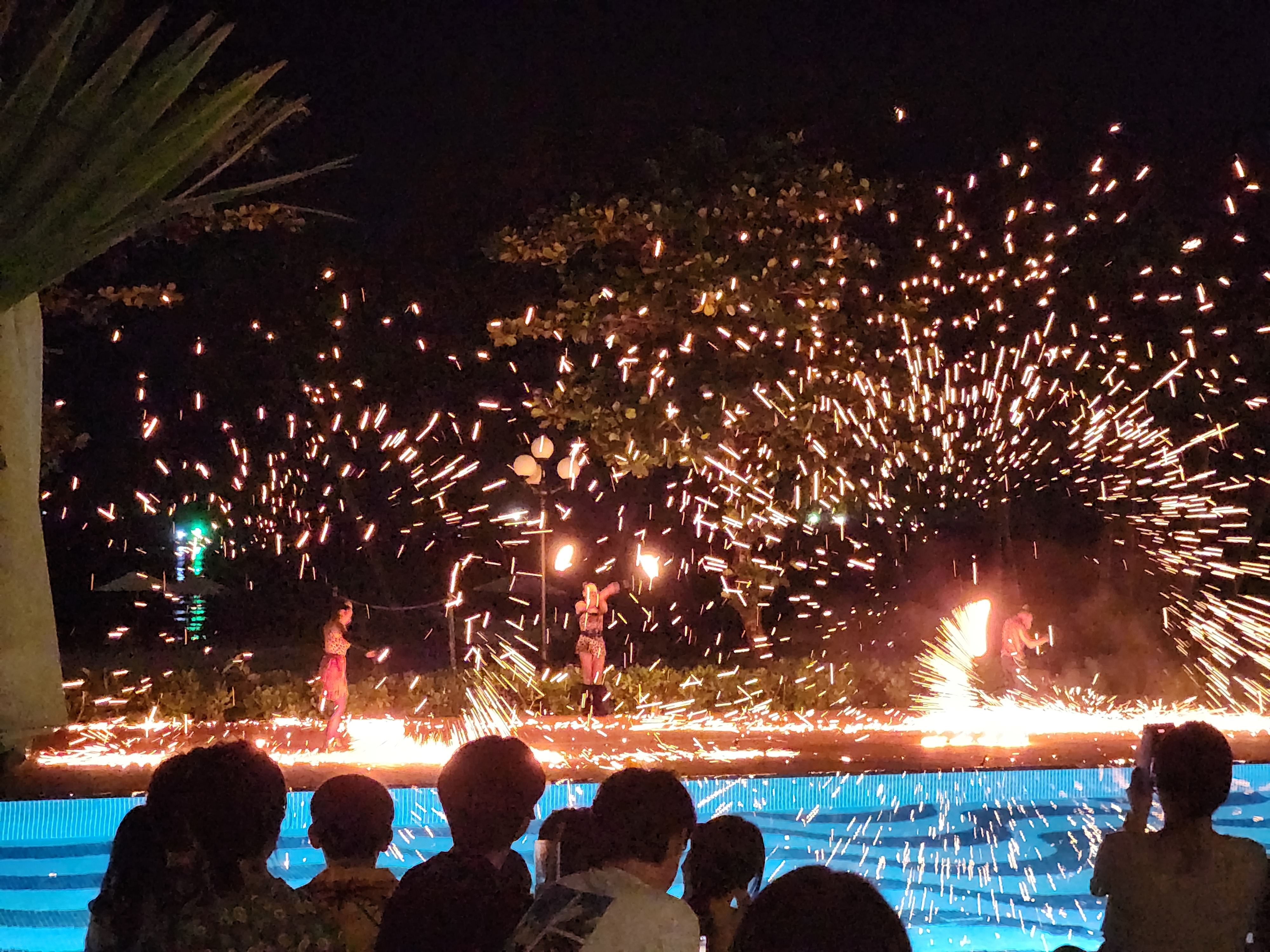 식사 도중, 세일링클럽의 하이라이트인 **불쇼**가 시작됐어요. 저녁 7시 30분쯤 시작되었는데, 박진감 넘치는 음악과 함께 펼쳐지는 불쇼에 아이들 눈이 휘둥그레졌답니다. 불꽃을 다루는 퍼포머의 동작 하나하나에 탄성이 터졌고, 푸꾸옥가족여행의 잊지 못할 순간 중 하나로 남았어요.